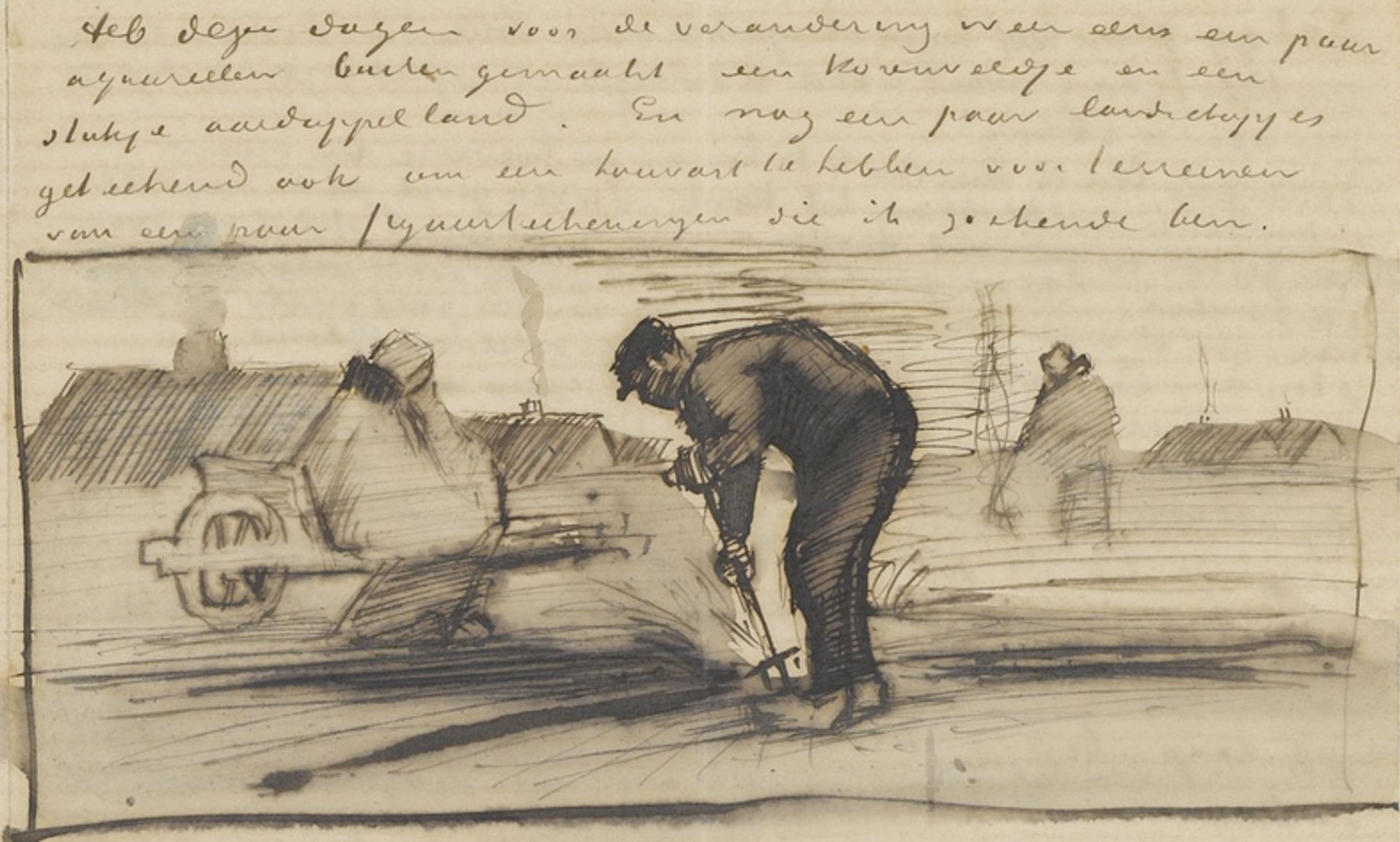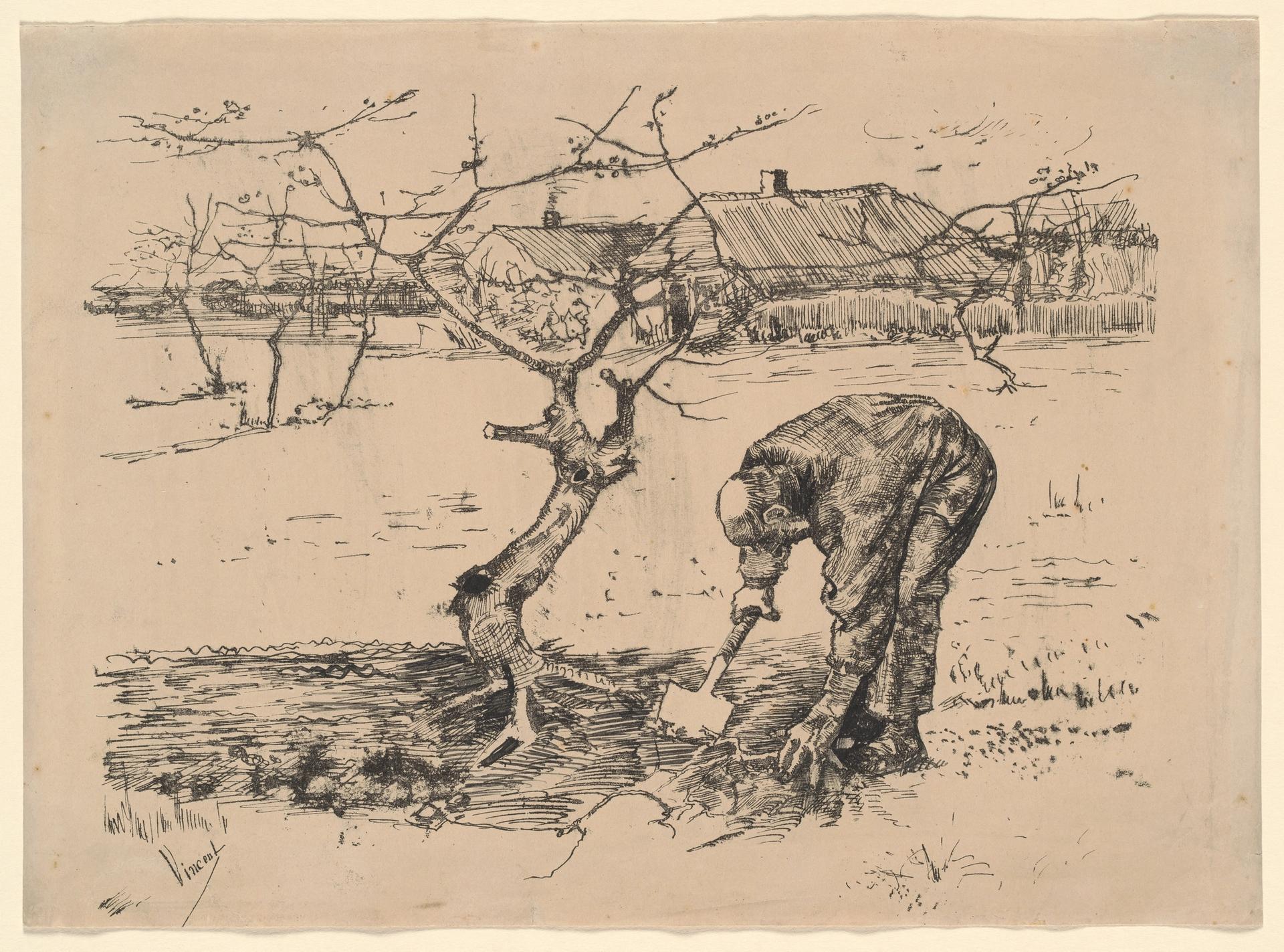 Gardener by an Apple Tree (July 1883), was based on a drawing that he made in the grounds of an almshouse in The Hague. Vincent again included a preliminary sketch of the image in a letter to Theo. The Met’s print has also been touched up with ink.