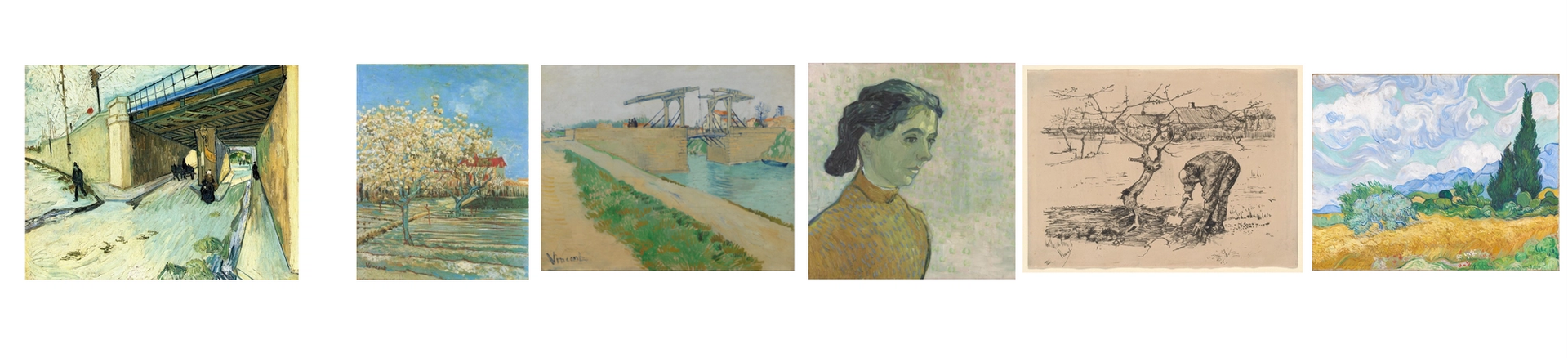 Our reconstruction of the sequence of Van Gogh works on the left half of Henry van de Velde’s scheme: The Viaduct (October 1888, private collection); Orchard with Pear Trees in Blossom (April 1888, private collection), The Langlois Bridge (March 1888), Van Gogh Museum, Amsterdam, Portrait of a Young Woman (June-July 1890, Kröller-Müller Museum, Otterlo), Gardener by an Apple Tree (July 1883, several collections) and a version of A Wheatfield, with Cypresses (September 1889, National Gallery, London).