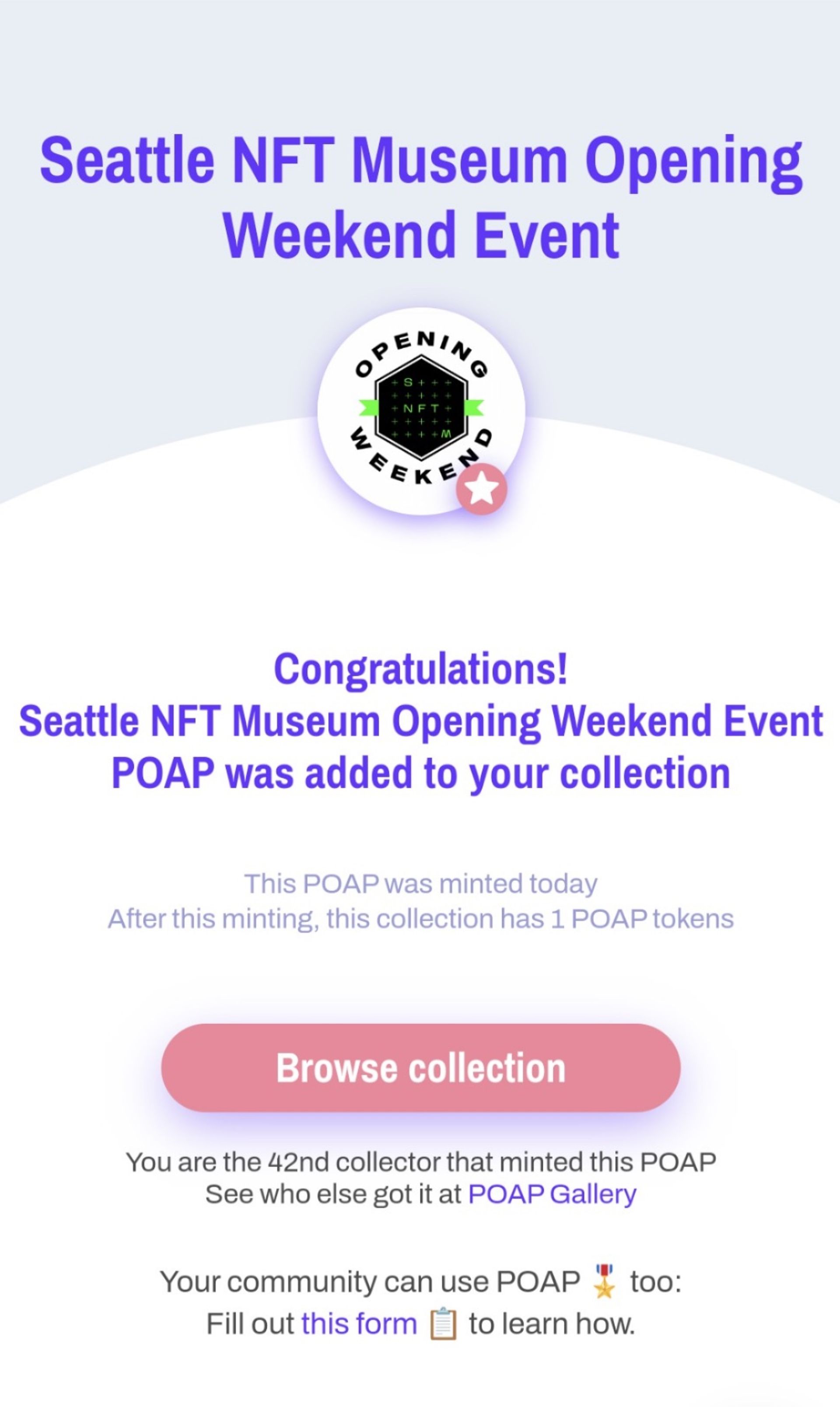 A screenshot of a minted POAP for attending the Seattle NFT Museum’s opening weekend event © Rain Embuscado