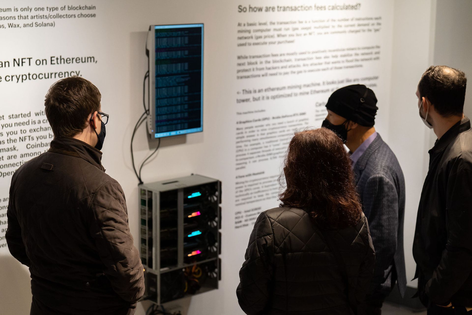 Wall text attempting to explain the blockchain-based system that undergirds NFTs is displayed throughout the museum. On the ground level, a crowded cluster of paragraphs traces the origins of NFTs, proceeding at length to speculate on their implications for the future of Web3. One level up, the museum’s lesson plan pivots to a somewhat technical overview of Ethereum mining machines. On the uppermost level, close to the back, a slimmer wall text titled “The Language of NFTs” lists some of the more common shorthand slang used by members of the subculture, such as DYOR (“Do Your Own Research”) and PFP, an abbreviation that refers to a type of NFT art used by fans and collectors as digital profile pictures.