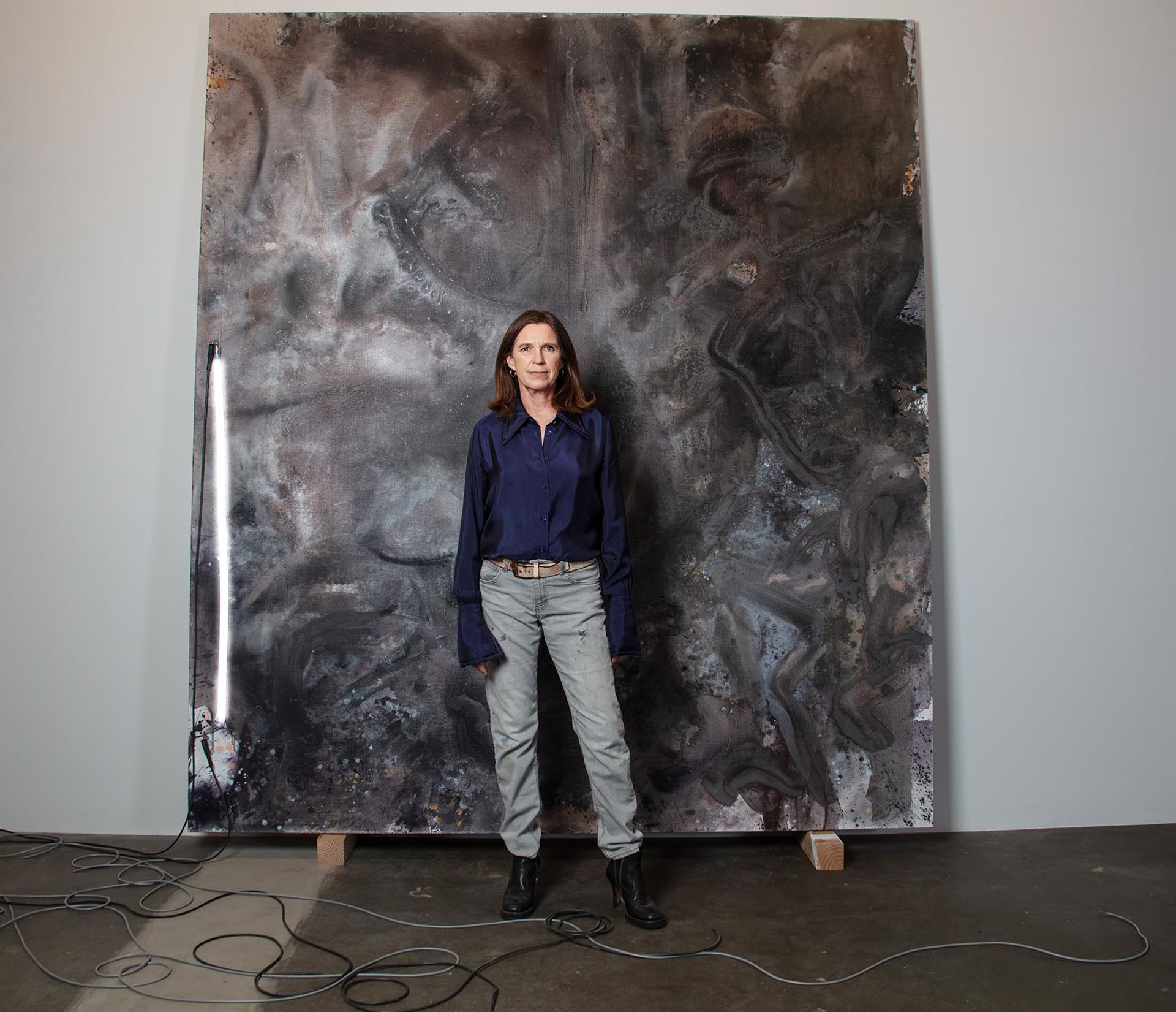 Mary Weatherford with her work The Flaying of Marsyas—3500 Spectra, 2021–22 Photo: Elena Durham Courtesy Gagosian