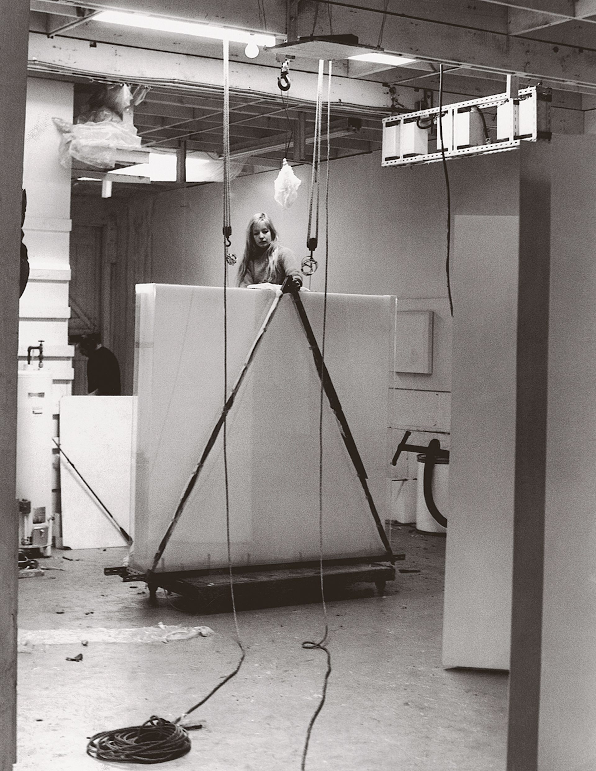 Mary Corse in her studio in Downtown Los Angeles with her light box work Untitled (1967) Photo via Wikimedia Commons/Bgeijer