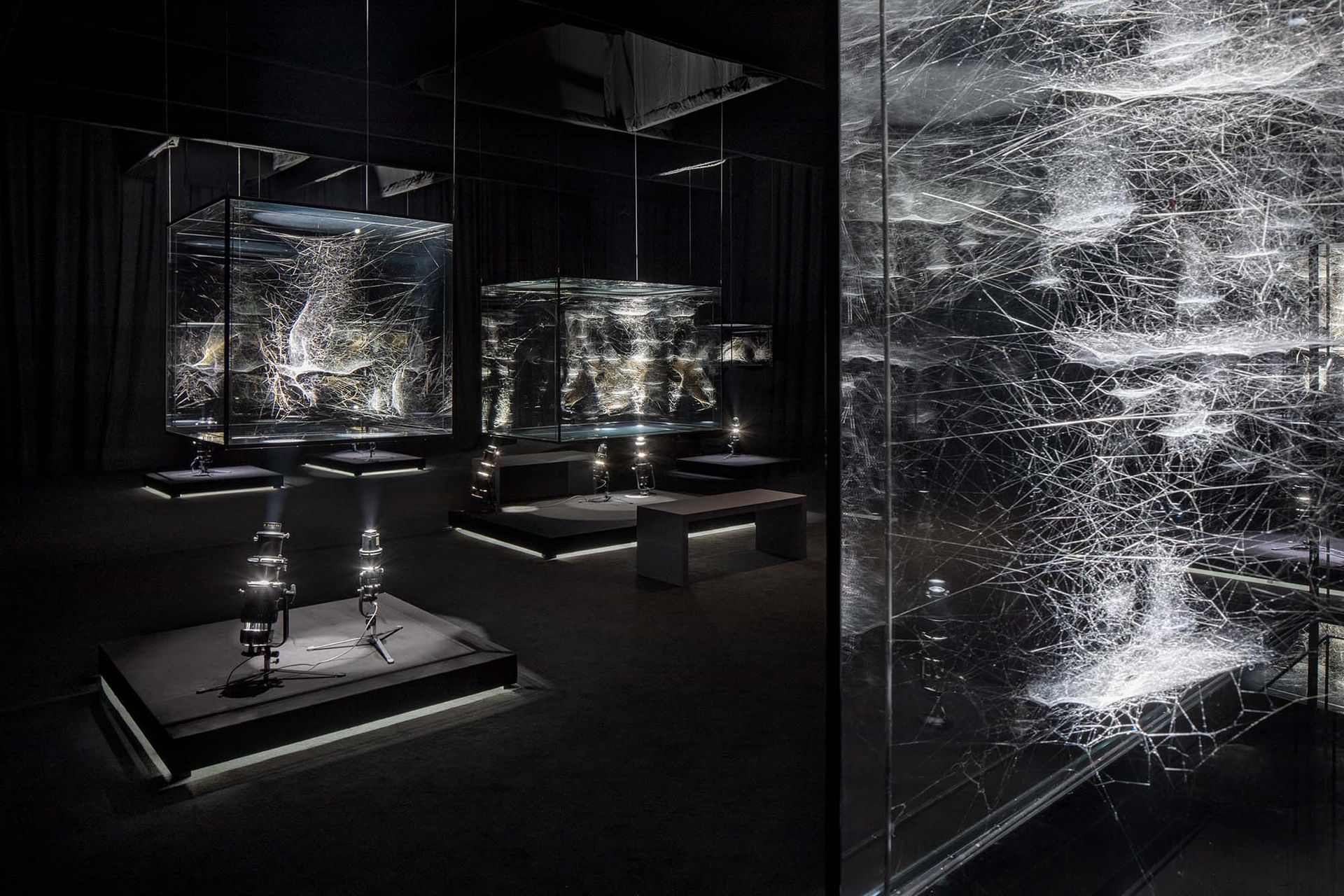 The Arachnophilia project celebrates spiders and the possibilities of interspecies collaborations. Its community of spiders and caretakers, or diviners, create living, silken architecture that form spider web sculptures, which Saraceno refers to as “spider/web” to emphasize the webs as an extension of the spiders. Displayed at The Shed in glass vitrines in completely dark rooms with bright lights illuminating each spider/web, the sculptures are intricate, visually stunning and underline the fragility of the spider ecosystem.