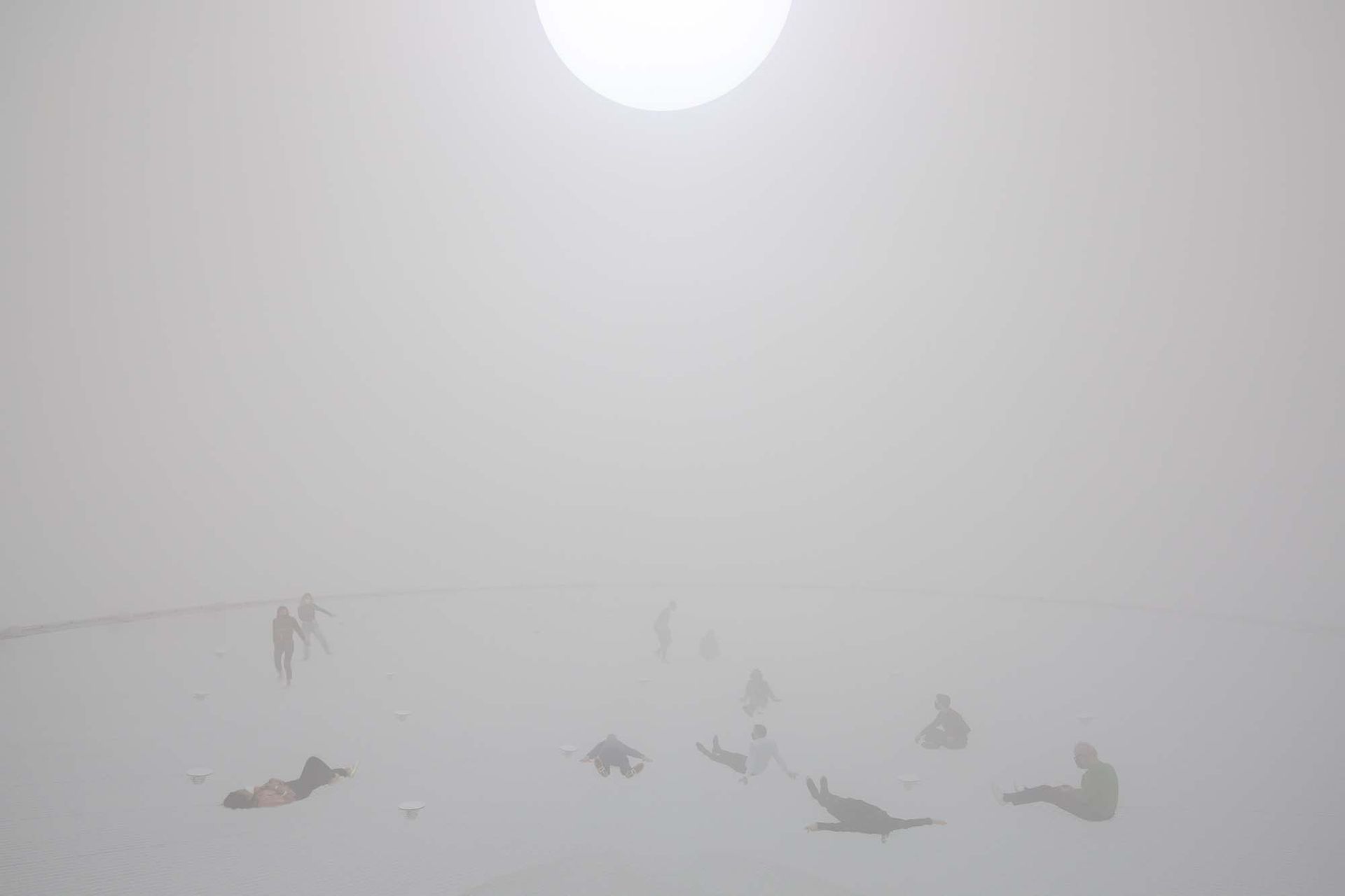 Starkly contrasting the near total darkness of most of the rooms in the exhibition, the domed walls, walkways, and nets of Free the Air are bright white and bathed in an ethereal light. On the 12 ft high level, rising mist amplifies this otherworldly feeling. Visitors on the higher level look down into the mist from the upper net, which shakes and bounces with every movement. Those on the upper level are not permitted to bring any objects, including cameras or phones, a welcome invitation to fully immerse oneself in the installation. Once visitors are sitting or lying down, the light suddenly dims to black and Saraceno’s eight-minute-long experience begins.