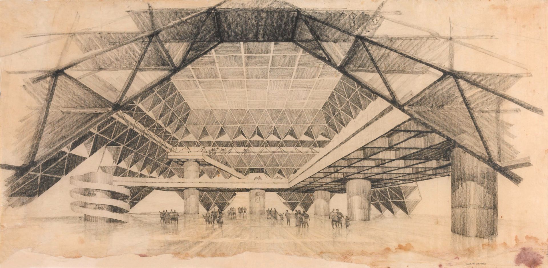 Hall of Nations, Pragati Maidan, New Delhi, India, 1970–72 (demolished 2017), by Raj Rewal Associates. Architect: Raj Rewal. Engineer: Mahendra Raj. Perspective drawing, around 1970. Musée National d’Art Moderne, Centre Georges Pompidou