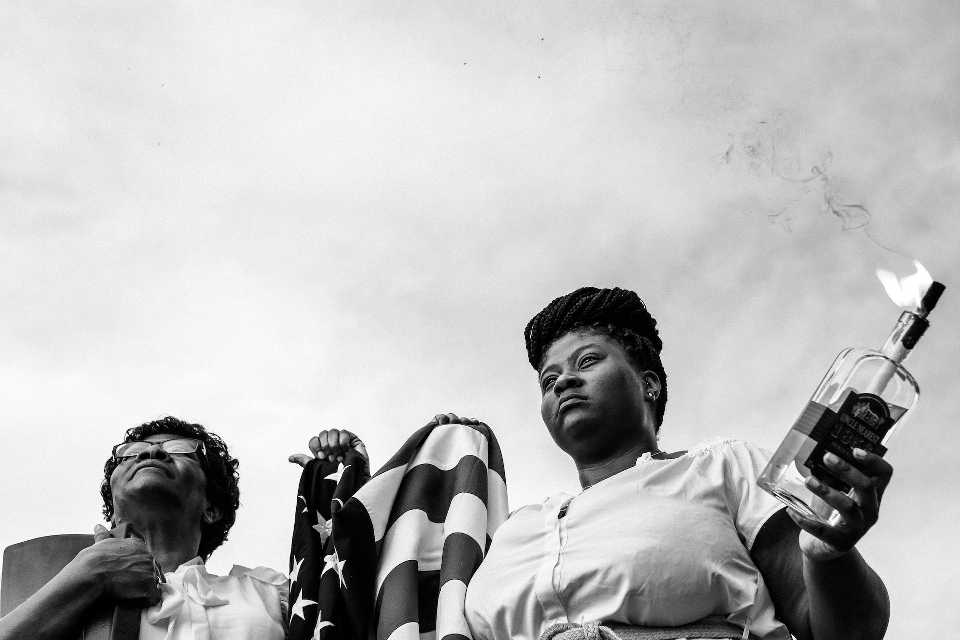 In a photograph by Cornell Watson called Righteous Rage (2020), two women stand together holding an American flag between them. The older woman on the left holds a bible to her chest, while the younger woman next to her holds a lit molotov cocktail. “Somewhere between prayer and burning it all down is the America we worked to build,” Watson is quoted saying in the exhibition’s wall text. Next to Righteous Rage is a piece called The Drowning (2020), a haunting image of a man who is lying on a US flag on a riverbank, and is partially submerged. The horror of the image is nearly eclipsed by an anecdote shared by the artist, recounting the day he shot the photograph. He recalled, “A white woman paddled by in her boat. She yelled to her husband, ‘Look honey! Look at the flag, that’s just not right!’ She could only see the flag submerged in the water and not us drowning in it.”