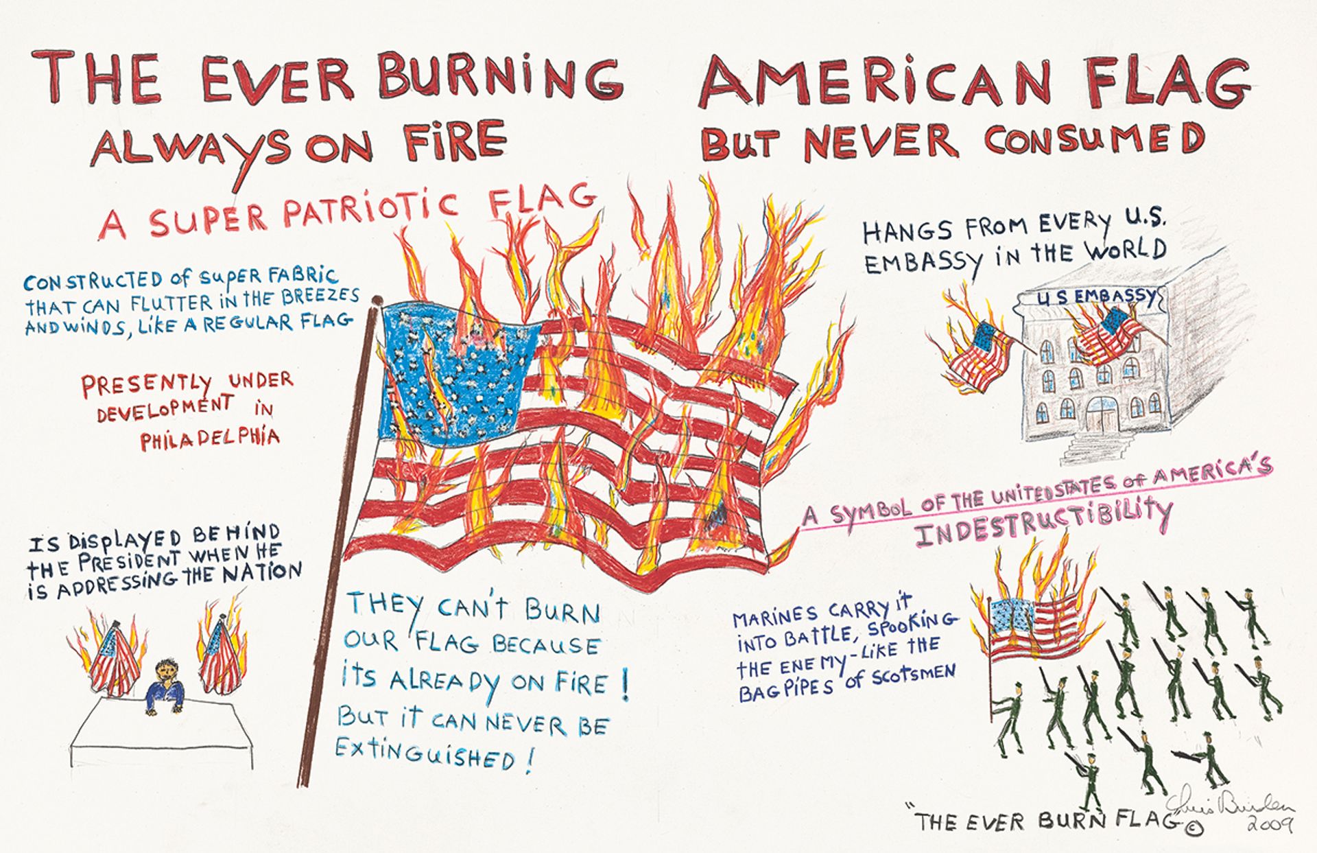 Incendiary idea: Burden’s drawing for The Ever Burning American Flag (2009). He wanted to find a fabric that could stay lit without burning away, but never found the right material Photo: Brian Forrest. All works © 2022 Chris Burden/Licensed by the Chris Burden Estate and Artists Rights Society (ARS), New York