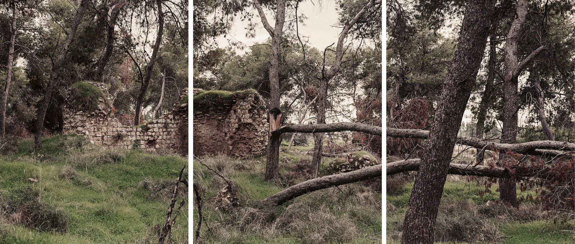 Fragmentation repeats as a formal feature in many the works on view in Catastrophe. Hippos, a video filmed at an ancient Hellenistic site in the Golan Heights, is bisected into two channels—one historic, one contemporary. The Catastrophe series of landscape photographs shows a pine forest planted by the Jewish National Fund after 1948, near Lod where Guez’s family lived, obscuring remnants of Palestinian homes damaged during the Nakba. The photos of these fallen trees and broken archways are splintered into triptychs. Another photographic series, 40 Days (2013), documents the deliberate desecration of family gravestones in Lod with images that are themselves poetically eroded after being stashed in a kitchen drawer (police were unable to use them to find those who perpetrated the hate crime and returned the photos to Guez’s family, who put them in a drawer for years).