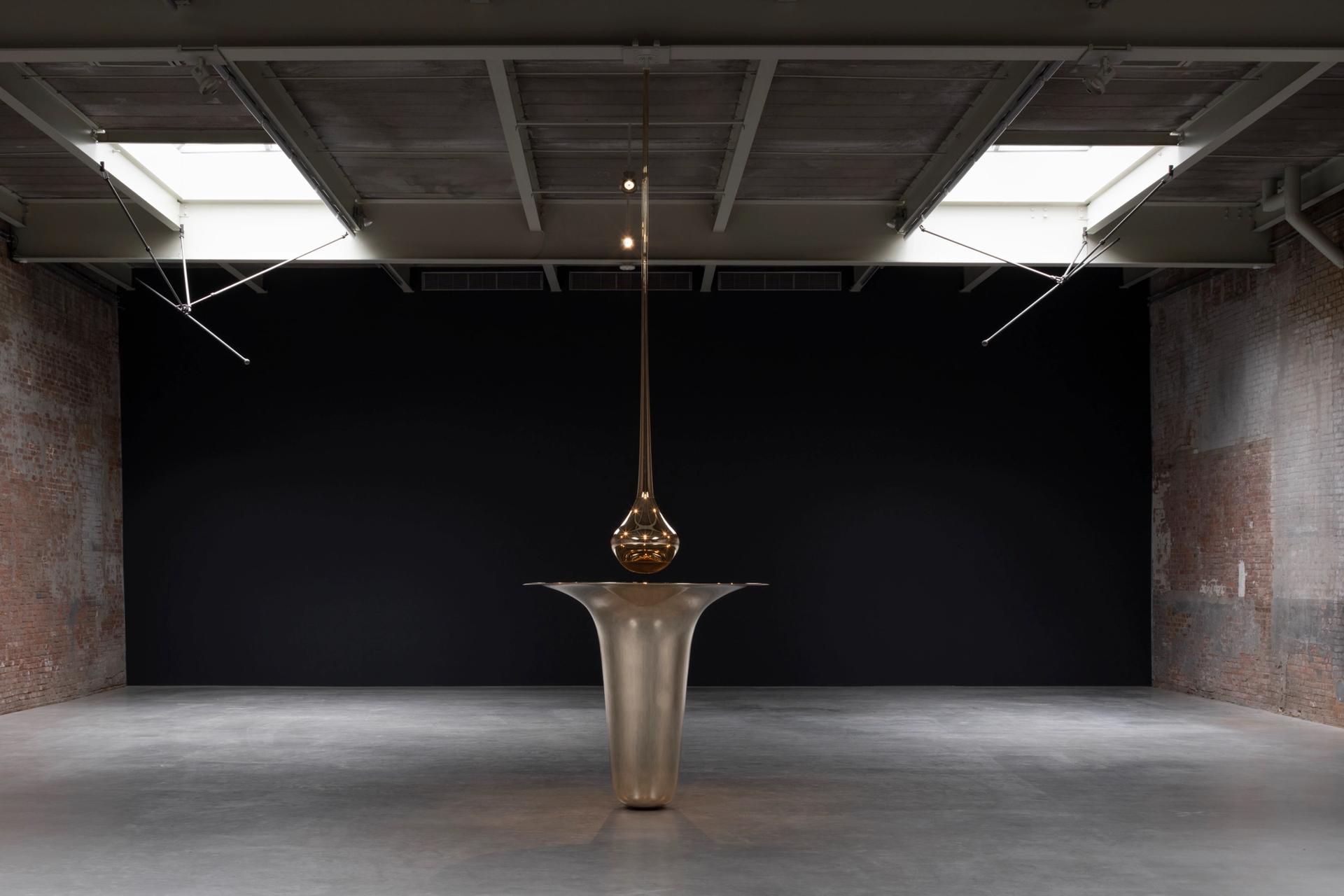 One space houses a brass vessel resembling an inverted bell, with a teardrop-shaped sculpture hanging from above that contains a built-in speaker, which amplifies the sound of bodies moving through the space via a feedback loop facilitated with four live microphones suspended from the ceiling. As visitors near the sculpture, the feedback becomes audible, reacting to their presence.