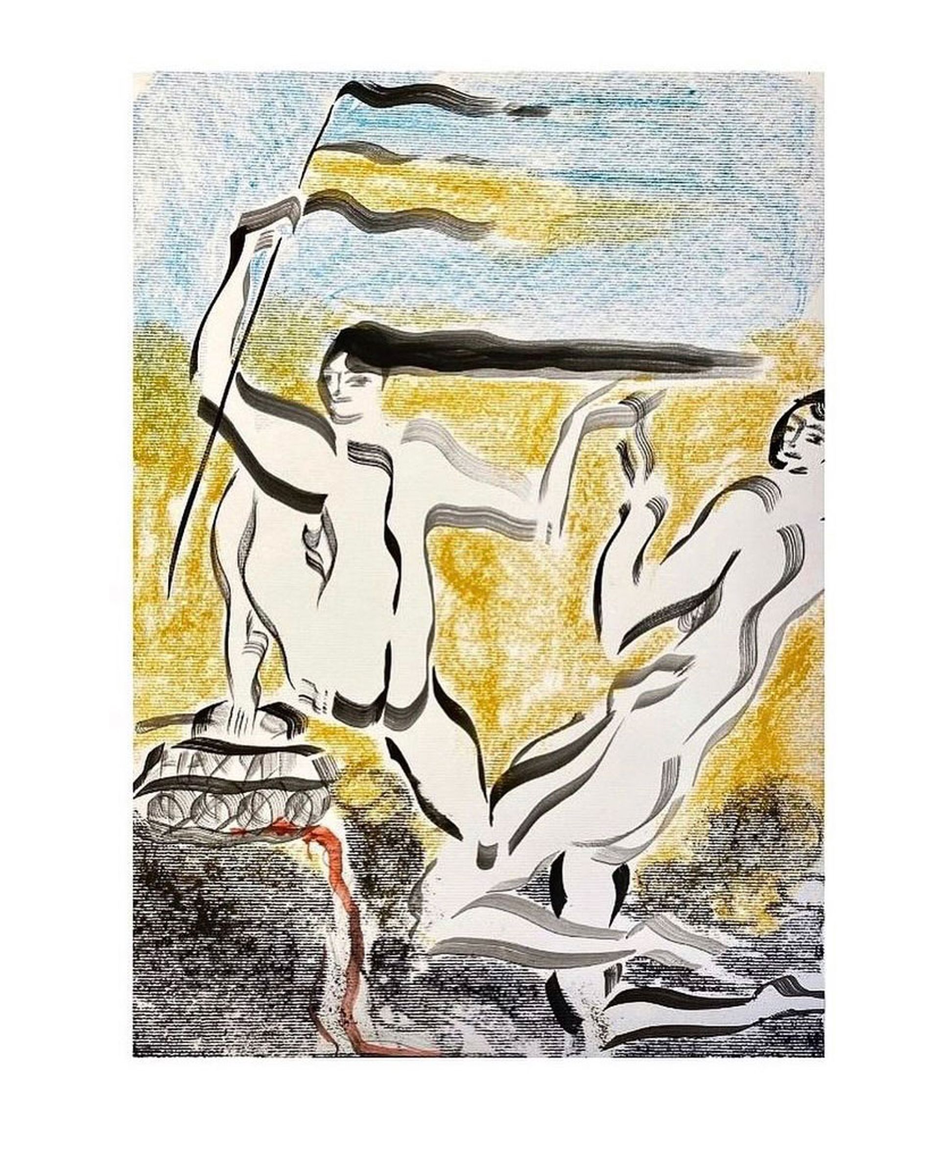 The painter Sana Shahmuradova, who left Kyiv to shelter with her grandmother in the countryside, says she had had to adapt her painting technique, swapping oils for her brother’s crayons and drawing on the back of old wallpaper. One drawing of a woman vanquishing the enemy (symbolised by a snake) was made with leftovers from dinner. “I was sharing the table with my grandmother, who was peeling boiled beet while I was drawing with charcoal,” she says. Some of Shahmuradova’s drawings are poster-like calls to action. For instance, asking the world to “close the sky” over Ukraine to stop Russia’s aerial attacks. “One of the positive drawings was inspired by a civilian from [Russian-occupied] Kherson who jumped on a Russian tank with a Ukrainian flag,” Shahmuradova says. On 5 March, thousands of Ukrainians protested against the occupation in Kherson’s Svobody Square. “I admire the bravery of everyday people in Kherson, who are defending their city without any help,” Shahmuradova adds.