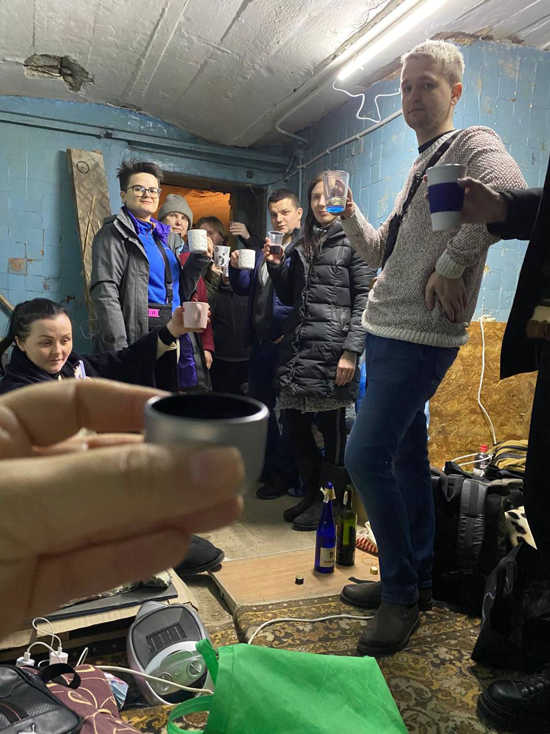 “After a long day of working to make our basement safe, we brought two bottles of wine leftover from my birthday to toast to our soldiers, our warriors,” says Olia Fedorova, pictured here second from left