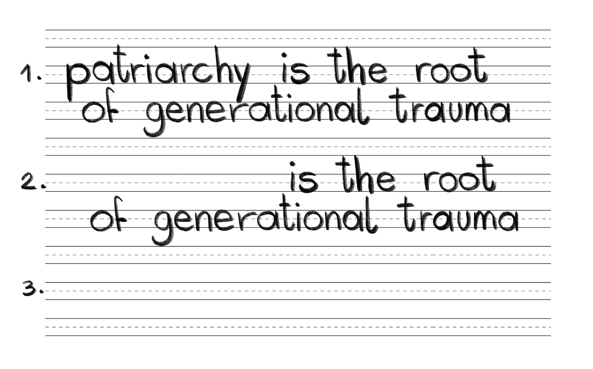 In Paiz’s work, a schoolbook-like grid features the handwritten phrase “patriarchy is the root of generational trauma” and a second version of the same sentence with a gap in place of “patriarchy”, as if inviting passersby to articulate the forces oppressing them. “I wanted to meditate on how I see patriarchy and its impact in the world, in the women and men around me, in my life,” she says. “Besides the bold financial, social, cultural, political inequality there is a deep subconscious programming that doesn't allow many people to see these gaps, therefore they are accepted and perpetuated.”