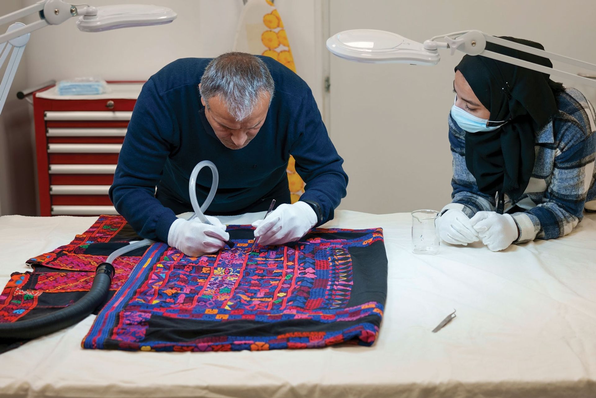 Conservation of a Palestinian embroidered thobe from Bir al-Sabi’ (1940s) at the Palestinian Museum in 2021 Photo: Hareth Yousef; © the Palestinian Museum