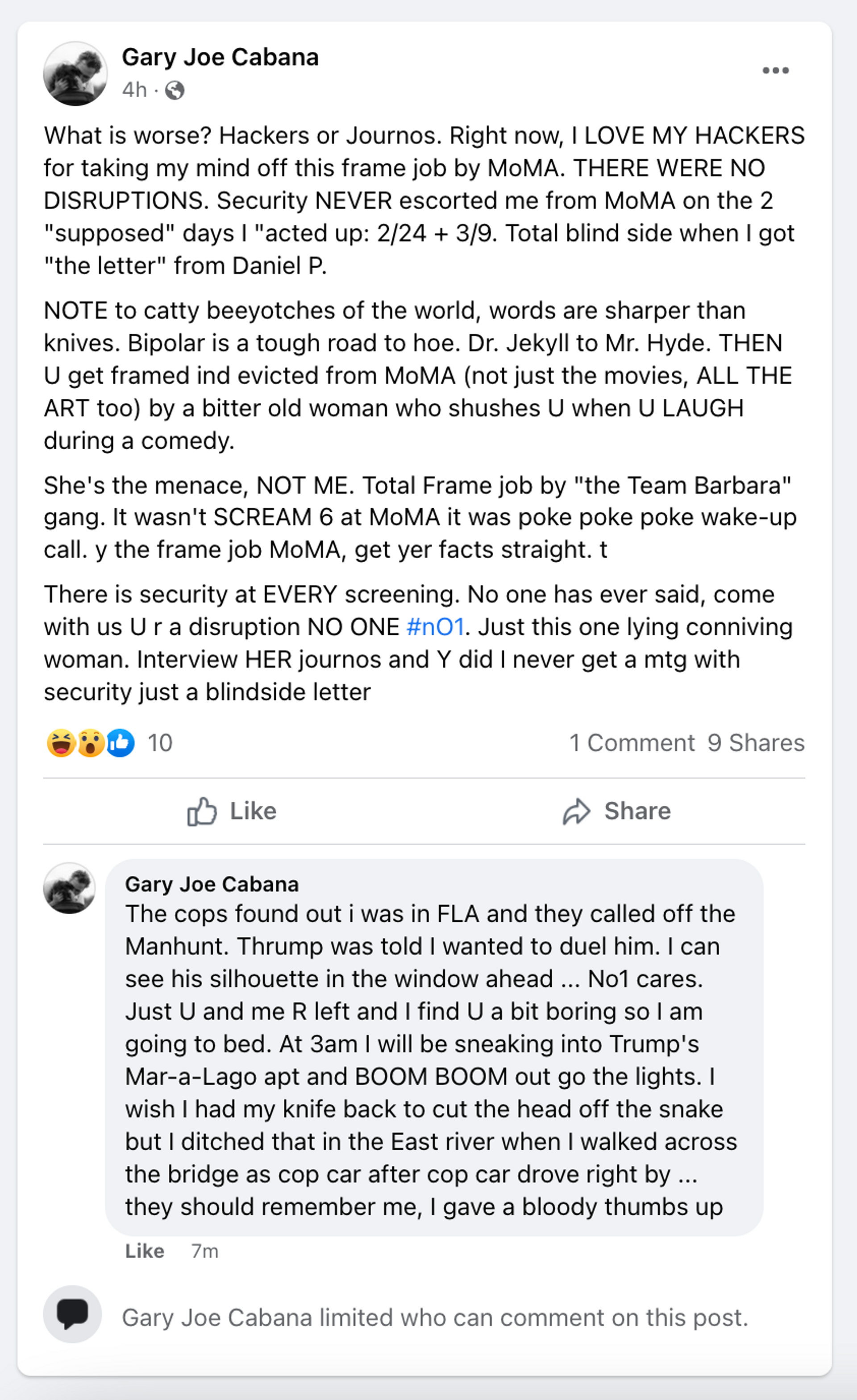 Cabana posted an erratic message on Facebook on 13 March stating that he was blindsided by his ejection from the museum, that he blames a woman named Barbara and that he suffers from bipolar disorder. In a since-deleted comment captured by The Art Newspaper under the same post, Cabana also claimed to be in Florida and threatened to trespass into former president Donald Trump's Mar-a-Lago resort and home and “go out with the lights”.