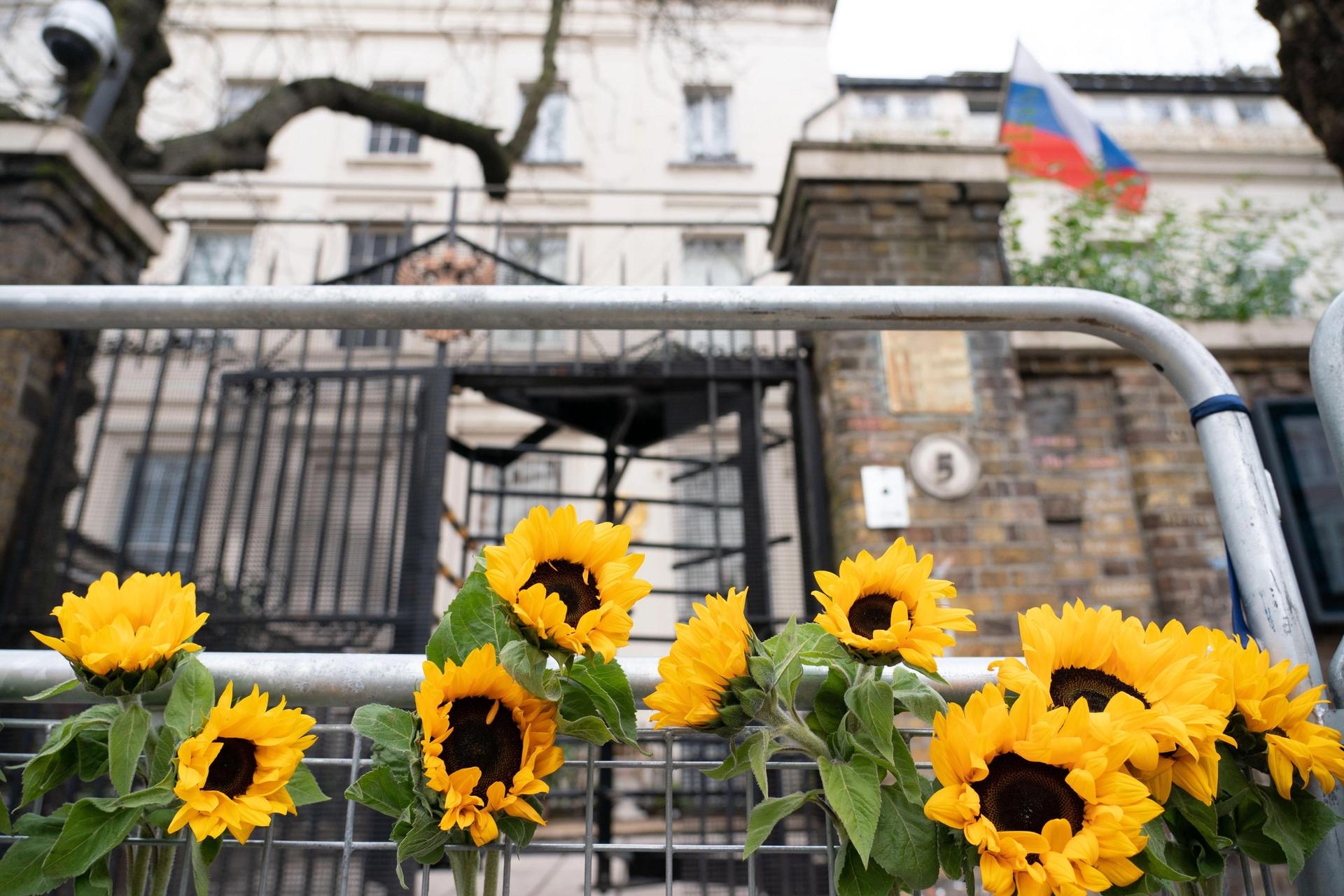 Sunflowers, which have become symbols of resistance and solidarity in Ukraine, were tied to railings outside the Russian embassy in London on 4 March Credit: Dominic Lipinski/PA Wire