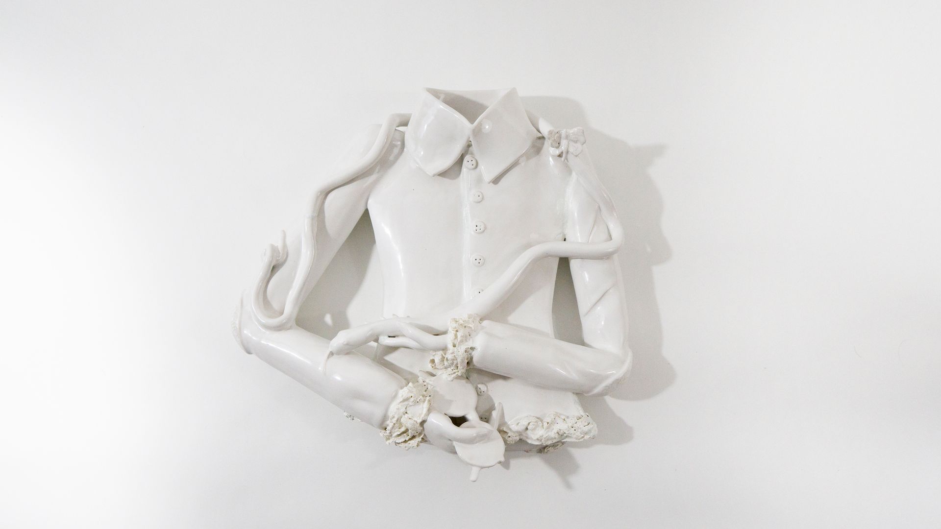 Jen Dwyer touches on one of the more personal consequences of the pandemic: the way in which our personal lives, private homes, public personae and work spaces all bled together. Spaces that were once private became our Zoom backgrounds and had to be arranged with objects coded with visual cues to project a specific message about our personalities. In Garden of Archetypes, Dwyer presents a female character preparing to leave her private bubble and enter the public sphere. Dwyer defines her character with Rococo-inspired ceramic objects like a pristine, white shirt set aside for future wear and manicured nails tapping on a keyboard. Like our meticulously curated shelves and backgrounds, the show points to the role of material culture in creating and communicating a sense of self.