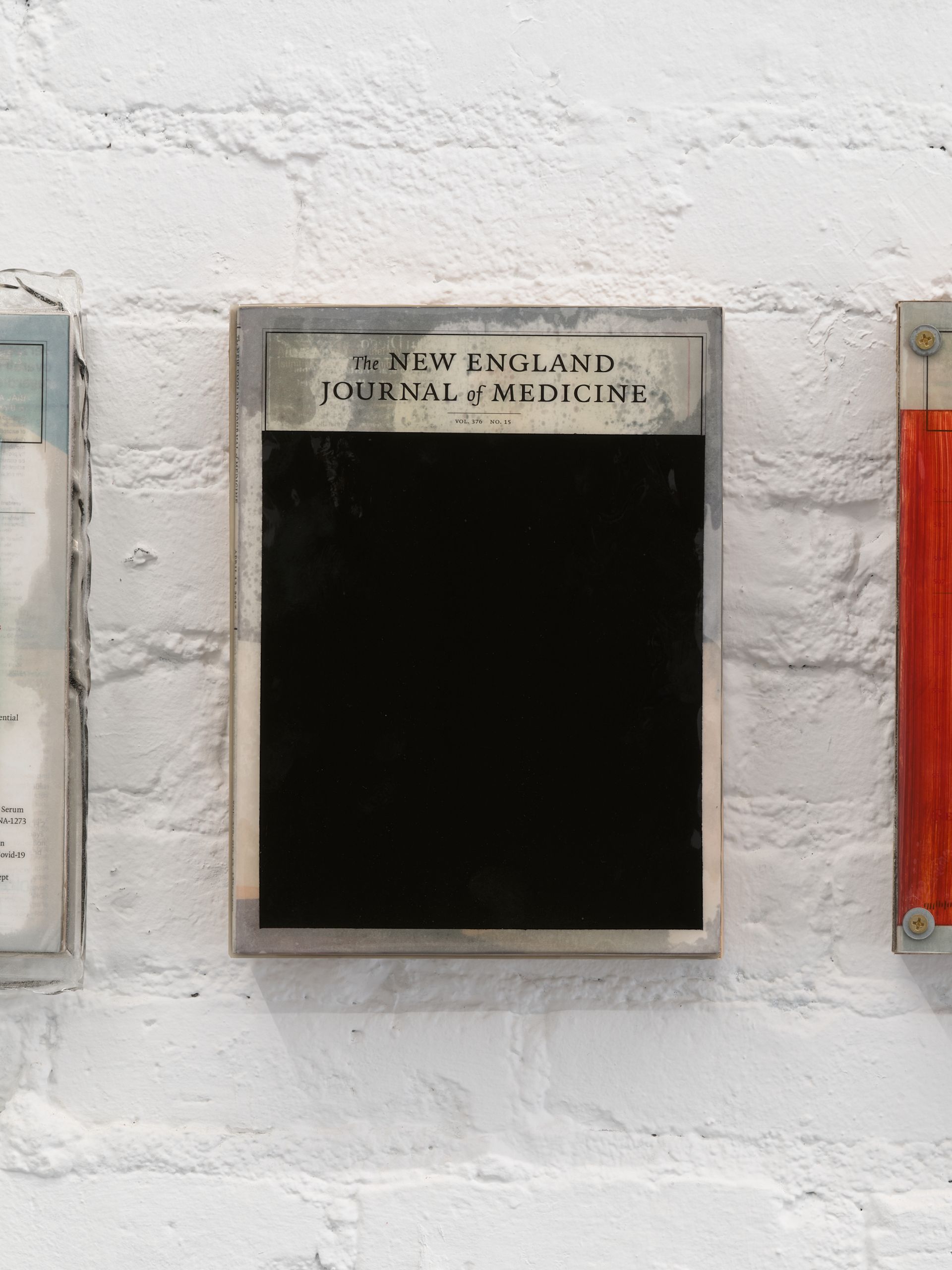 In AWAKE AWAKE ASLEEP, Trotter&Sholer presents a series of multimedia works by Alex Stern that all feature copies of The New England Journal of Medicine encased in resin and mounted on wood frames. Exploring topics of public health and the opioid crisis, the contents of the journals are obscured by words, imagery and actual objects like latex gloves and face masks. There is a sense of paying homage to medicine, as well as a hint of cynicism and censorship. In one work, black diagonal stripes cover nearly all of the journal’s text apart from the words “opioid crisis”. In another, aptly titled Erasure (2021), the entire page is obscured in black. The show points to how fluent the general public has become in medical language over the last two years.