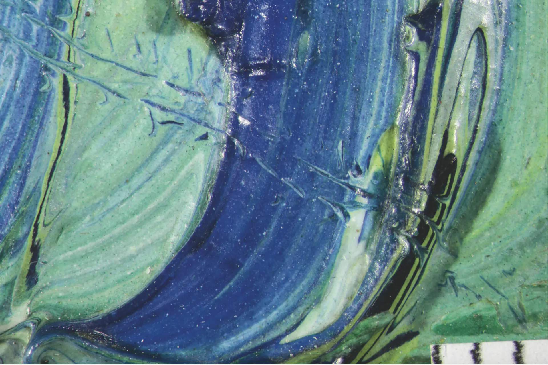 Photomicrograph of an insect walking through the paint, a detail from Van Gogh’s Olive Grove (July 1889). Courtesy of the Kröller-Müller Museum, Otterlo (photomicrograph: Margje Leeuwestein)