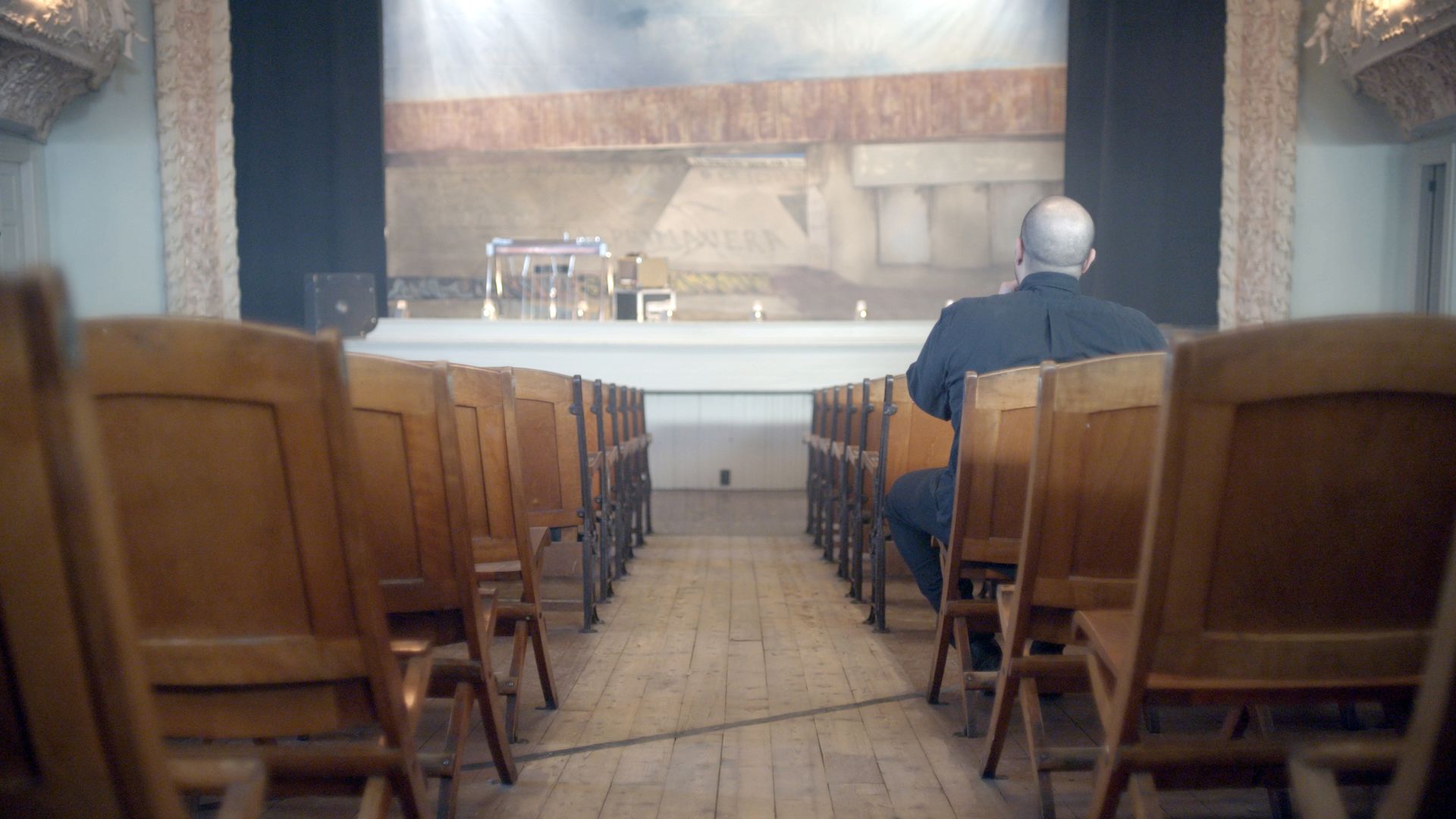 Mercer Union is showcasing Abu Hamdan’s film, 45th Parallel (2022), which focuses on the Haskell Free Library and Opera House, which straddles the Canada-US border along the 45th parallel between Quebec and Vermont, hence the title. The library and opera stage are in Quebec, but the bulk of the seats are in Vermont. Access is through the American side, though there is an emergency exit into Canada.