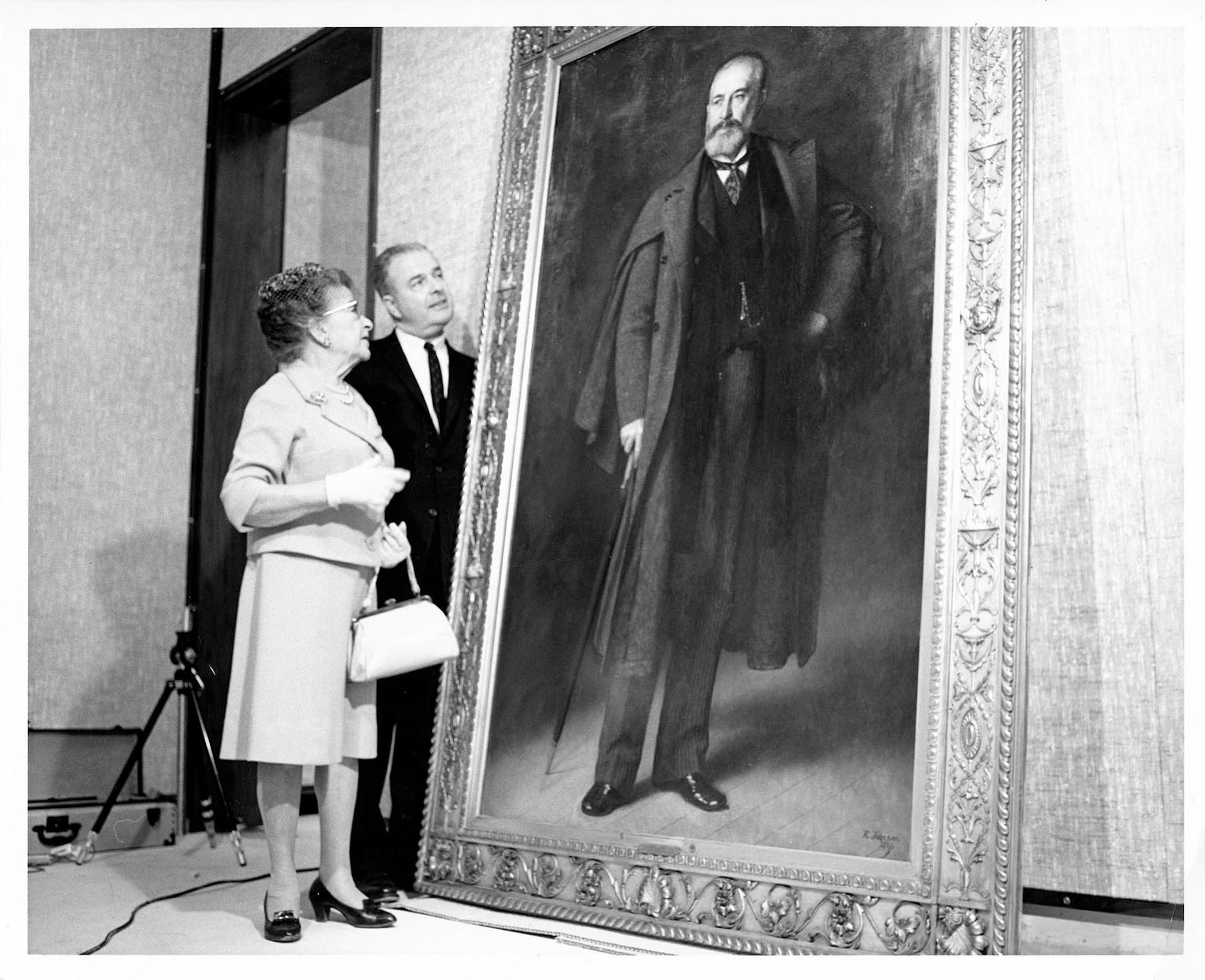 Charlotte Partridge and John Doyne standing in front of The Portrait of Frederick Layton (by Eastman Johnson) in the Milwaukee Art Center galleries in the mid-1960s Courtesy of the Milwaukee Art Museum
