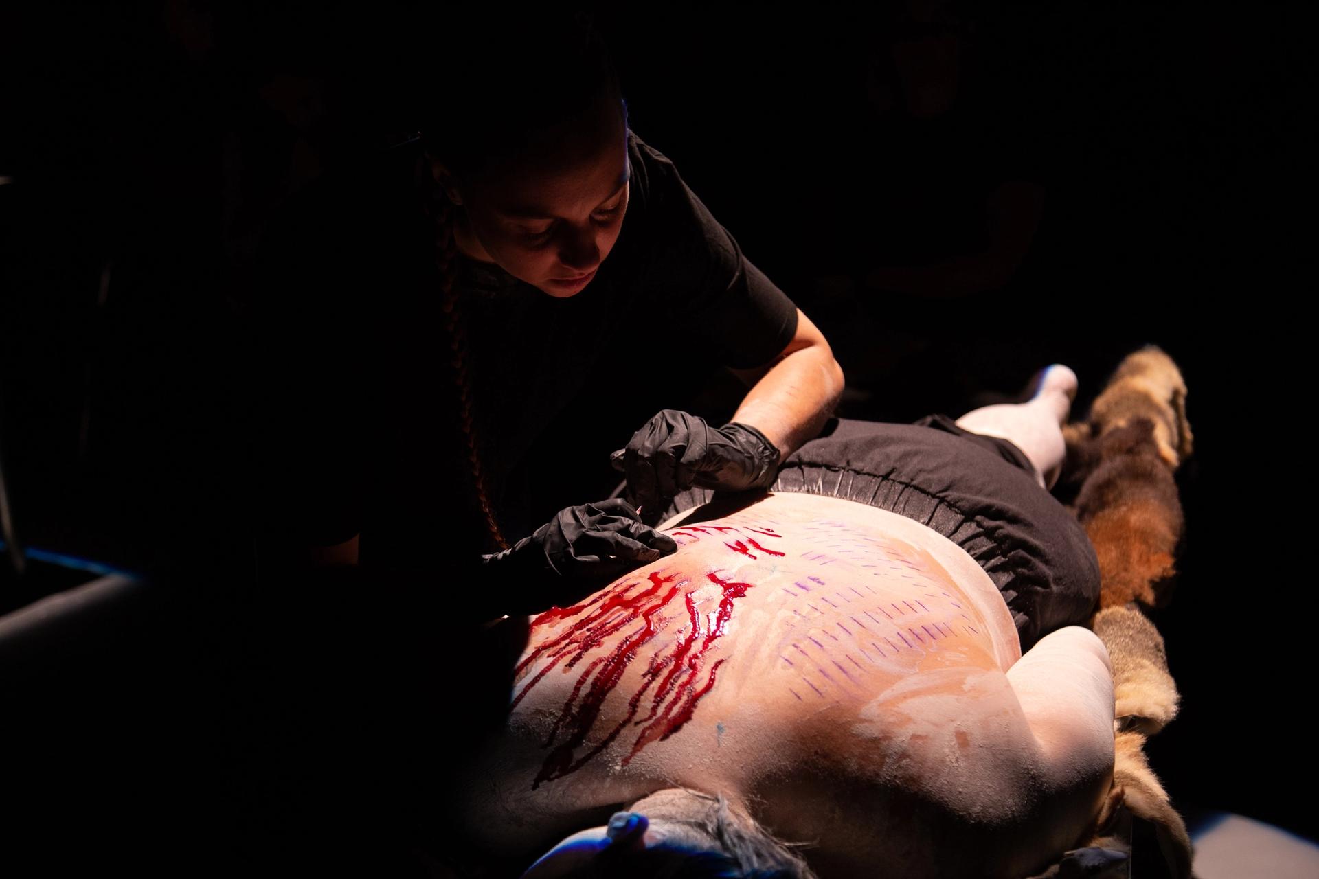 The 147-minute performance of ritual bloodletting—in which the artist was cut with a razorblade once each minute—was facilitated by First Nations assistants from Australia and Turtle Island. It aimed to “collectively focus our attention and intention towards the dissolution of settler-colonial carceral state”, Norman wrote in their artist statement.