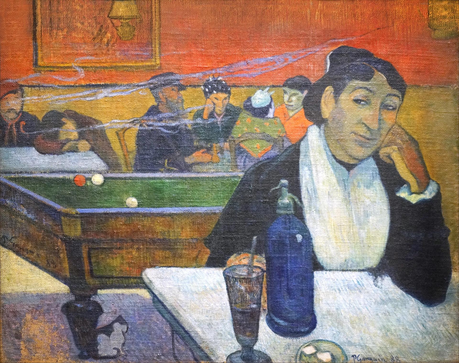 When Paul Gauguin arrived in Arles the following month, to stay with Van Gogh in the Yellow House, he made his own version of the scene—this time with Marie sitting by an absinthe and with a knowing look. Behind her are the billiard table, the café’s cat and half a dozen inebriated customers.