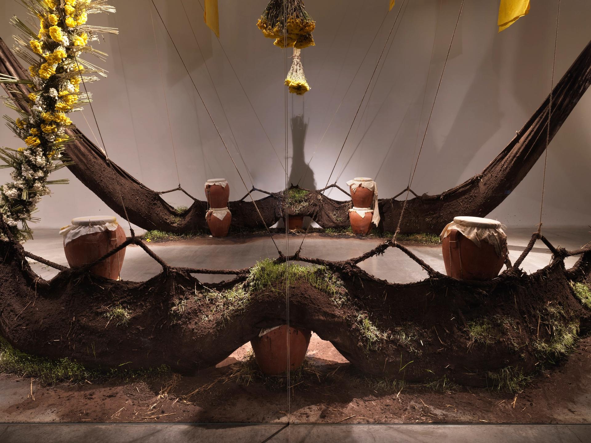 The Indonesian-Brazilian artist Daniel Lie has enveloped the ground-floor gallery of the museum with an engrossing living installation that evokes the animism of Afro-Brazilian spiritualism and broader meditations on death, rebirth and the in-between. The durational and site-specific work comprises several jute tapestries suspended from the ceiling that are filled with ephemeral organic materials like earth, sprouted mushrooms, minerals and other fertilisers, which will grow and decompose in the coming months. The altar-like space is stiflingly humid and filled with insects. Several arrangements of dried flowers and textiles dyed with natural pigments appear to ceremoniously flank ceramic pots that symbolically contain the spirits or “unnamed entities” in the work, or the “other-than-human beings” present there, as the artist puts it. The work underscores the coexistence between what can be perceived as sentient lifeforms and the life-force of what appears static to human perception.