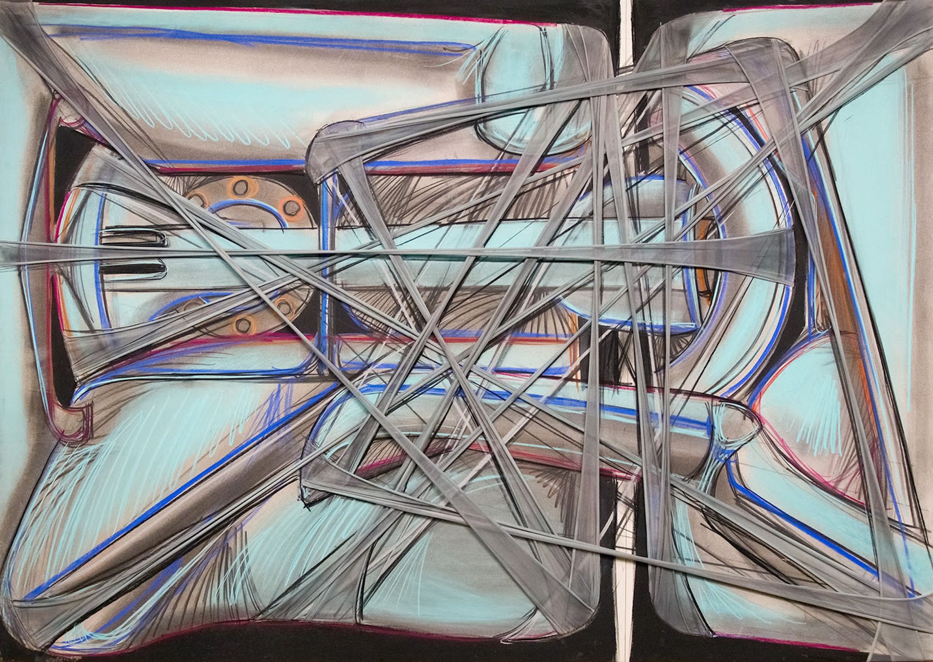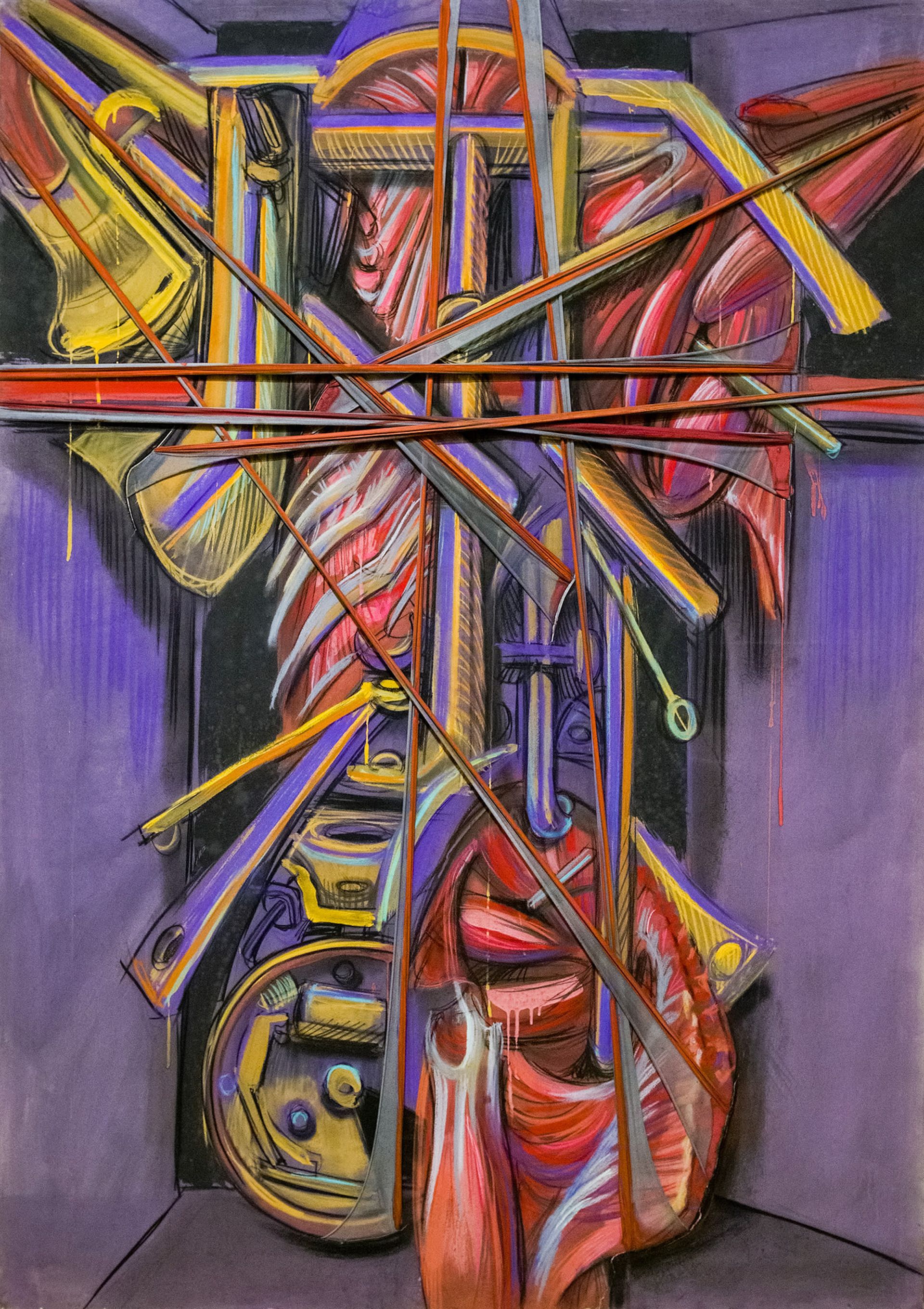 “That tendency of wrapping and creating surface tension he carried forward into the format of paintings, which is what is so unique and what captured our attention,” Taggart says. “He would make an artwork and create imagery, most of it having to do with automobiles and mechanical things, and then apply on top of that through a unique way these material wrappings over on top of the imagery. And so you end up with a medium that no one has ever seen before.”