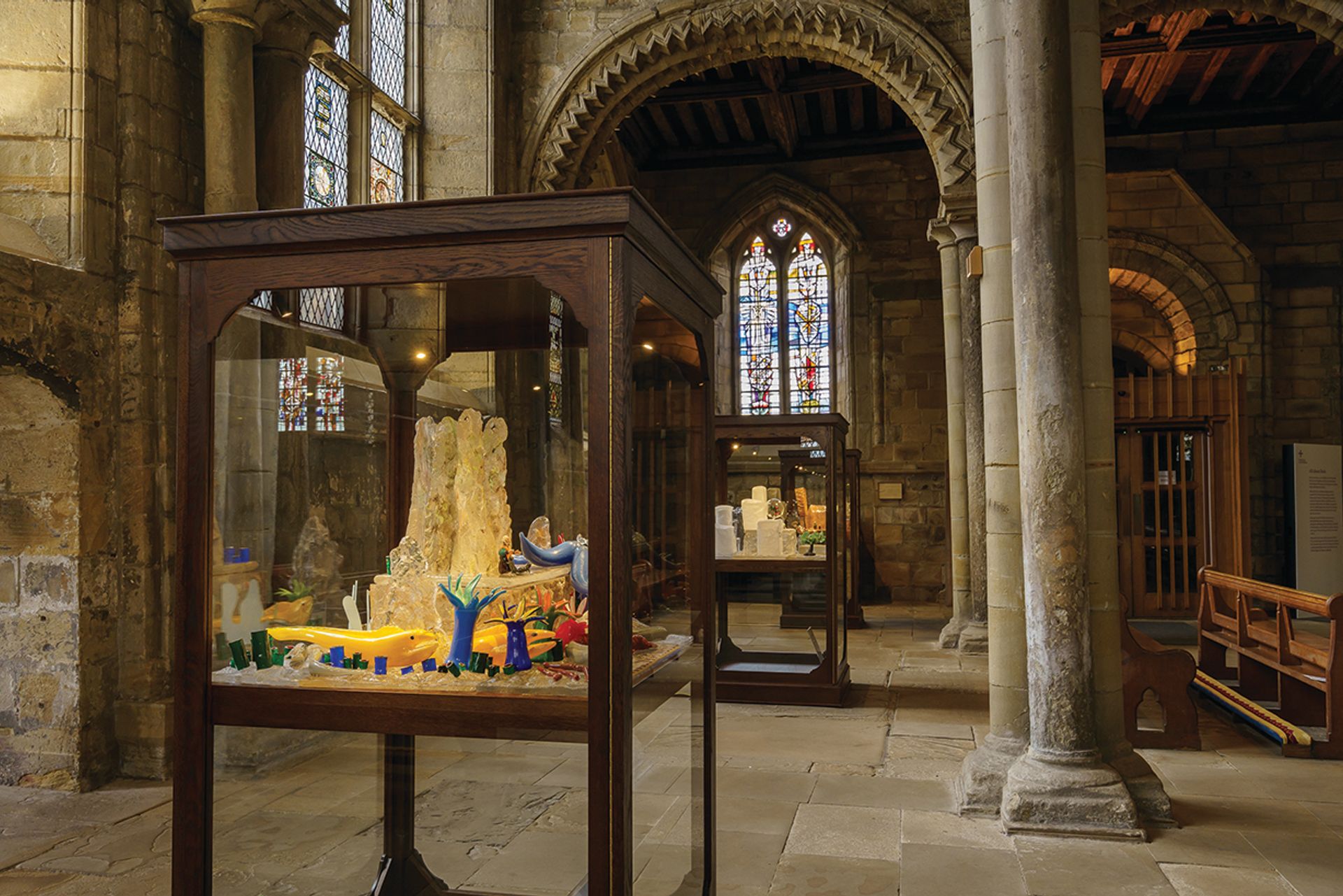 Installation view of Monster Chetwynd's The Life of St Bede (2022) at Durham Cathedral. Courtesy of National Glass Centre, Sunderland.