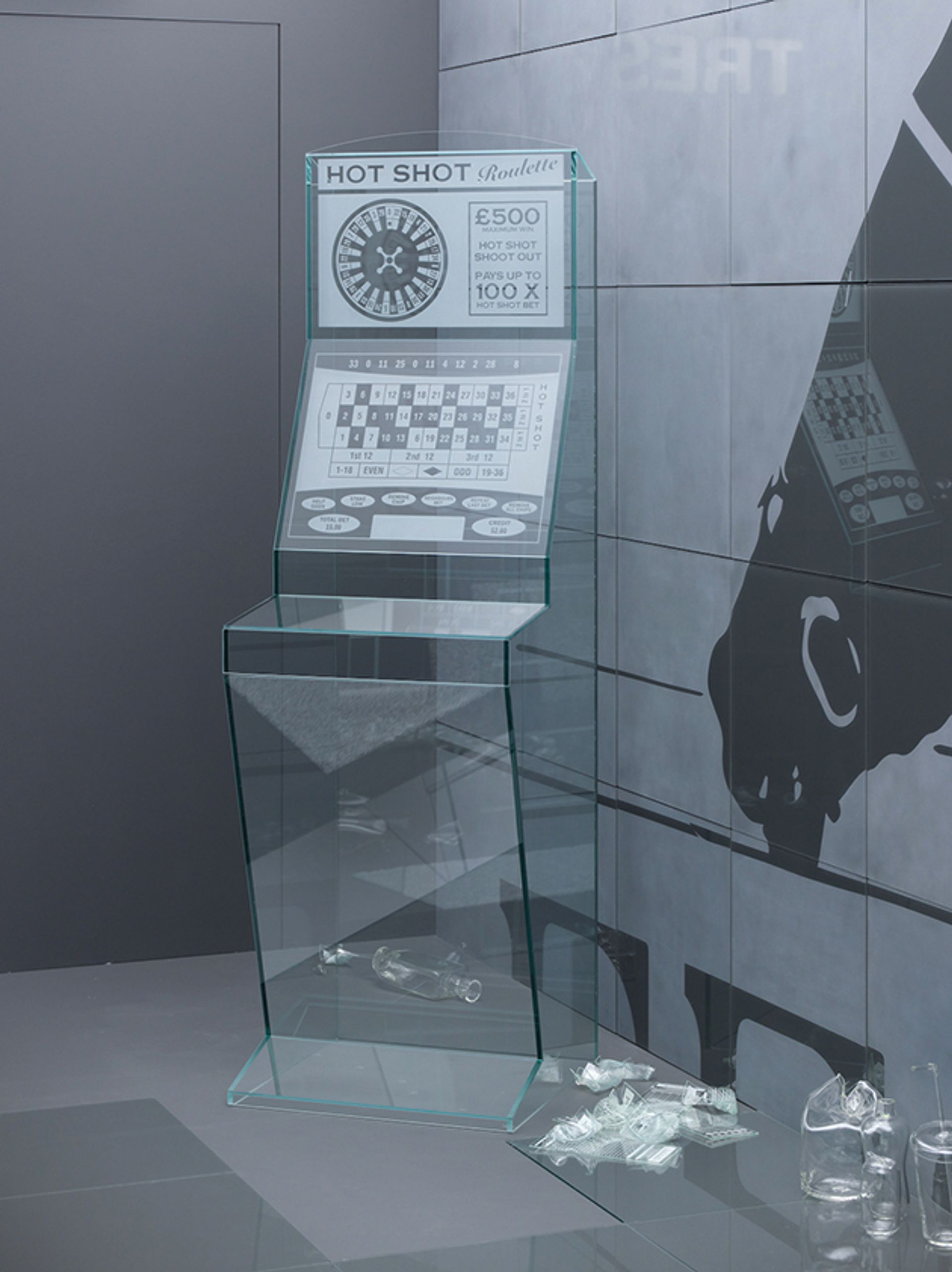 Gander’s deserted glass Ghost Shop is a technical tour de force with all fixtures and fittings, including fire extinguishers, posters, betting slips, a wastepaper bin and even carpet tiles all rendered in various permutations of plain, clear glass. “Everything was made from glass or UV-treated invisible glass glue,” he says, “so it really is like a mirage, as if somebody has just sucked all the colour out of the real world.”