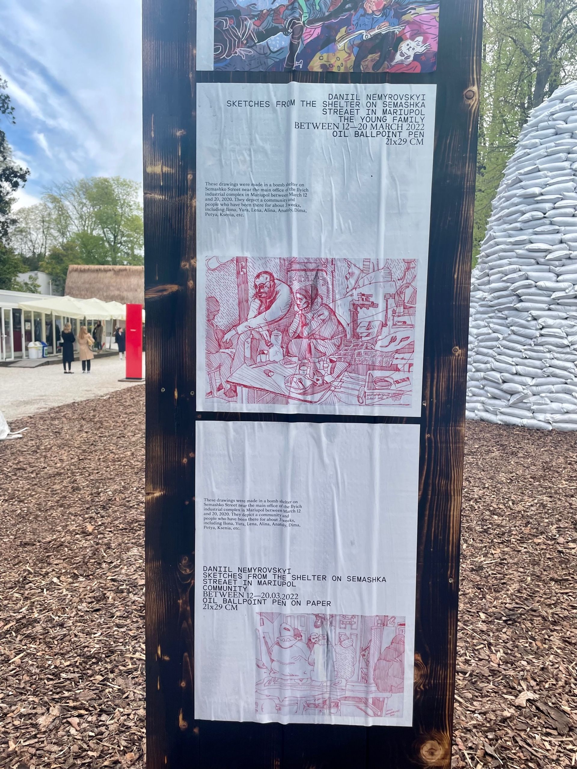Dark bark chips mark the area of the pavilion: within it sits the pergola, a mountain of sandbags, and several scorched totems that are covered in posters featuring Ukrainian art. “The posters will be changed every few weeks,” Kosmina explains. The several-metre-tall sandbag monument represents the heritage sites currently being protected by locals in Ukraine; community groups have worked together to cover statues in sandbags to limit the damage being inflicted by Russian attacks.