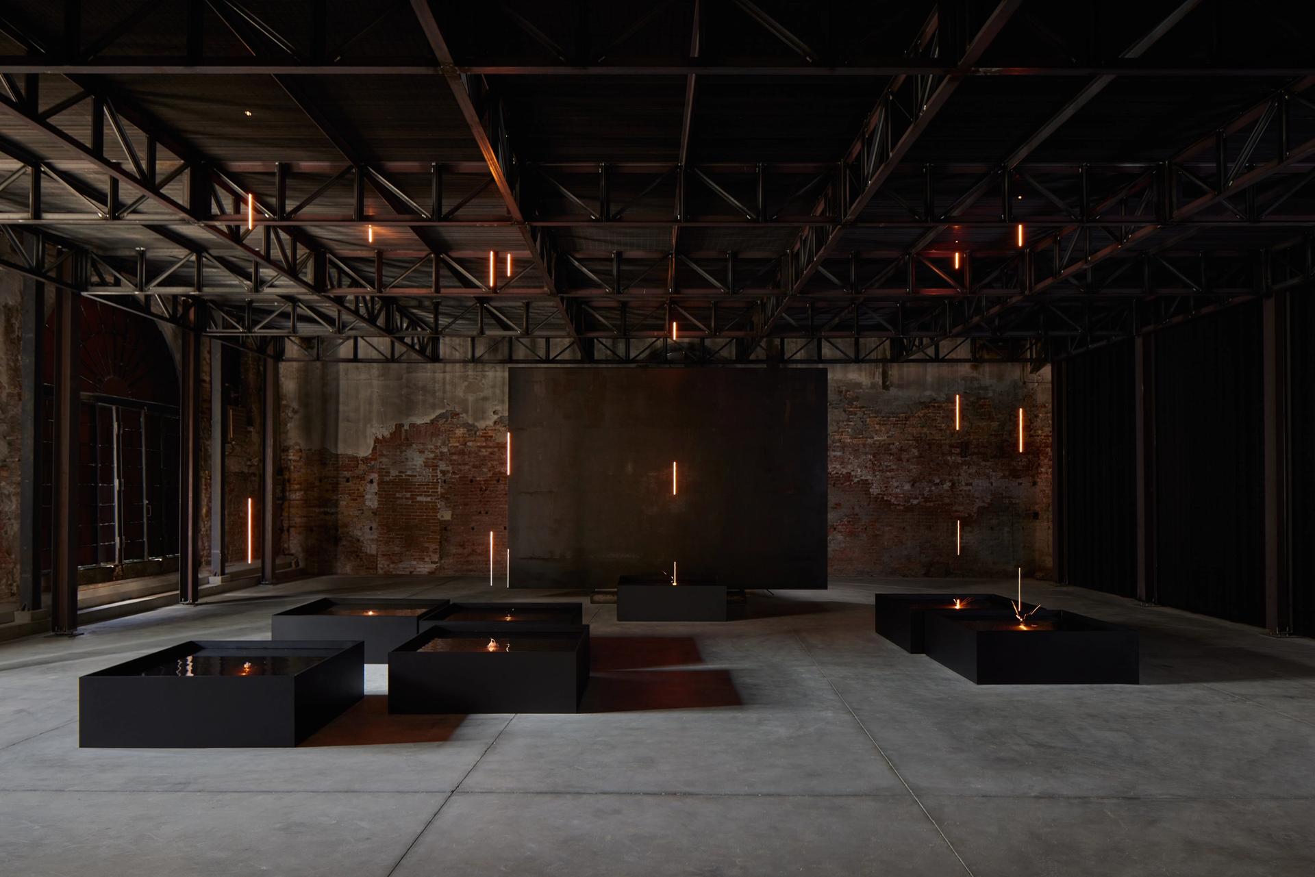Entering the Maltese Pavilion is a little like coming upon the final moments of a biblical storm of fire and brimstone. Drips of actual molten steel drop down into seven square water tanks, each representing the figures in Caravaggio’s The Beheading of St John the Baptist (1608). A complex system is hidden in the installation’s ceiling, feeding a loop of steel through an induction system that heats it to 1,500°C before it drips down, like a miniature ball of liquid fire, before fizzing out in the water.