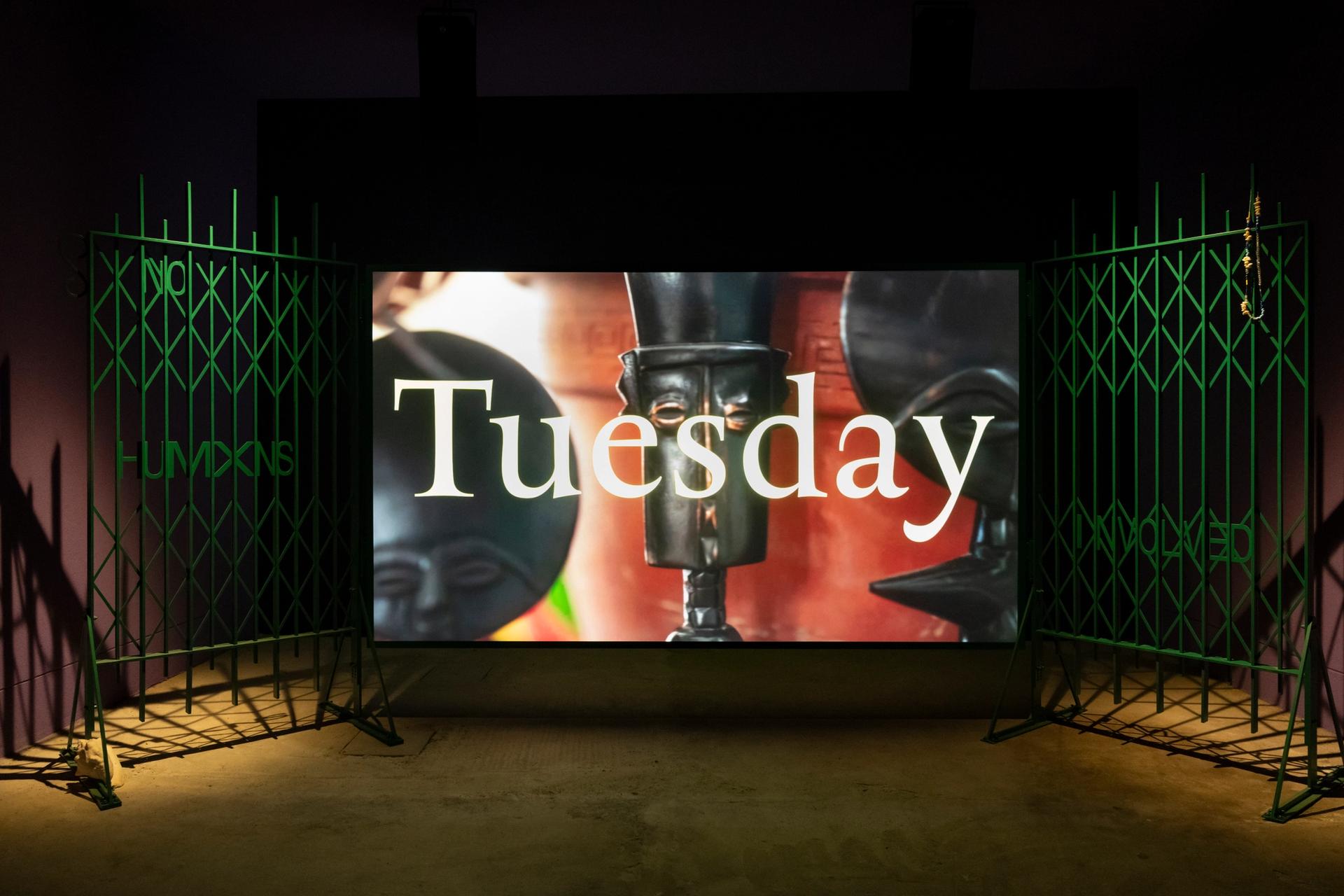 An installation view of deep dive (pause) uncoiling memory (2022) Photo: Cristiano Corte © Alberta Whittle; courtesy the artist, Scotland + Venice