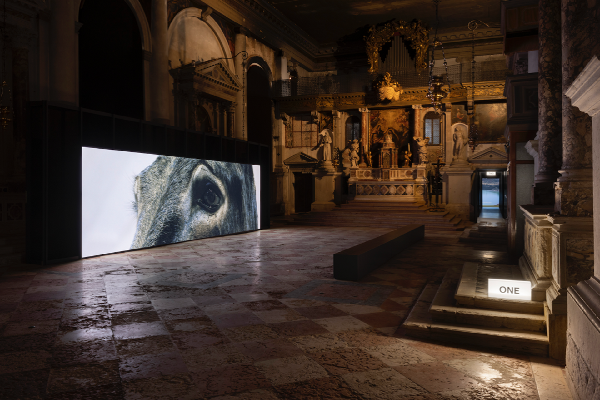Almost 500 years ago, the Santa Maria dei Derelitti church in Castello was filled with the harmonic voices of disabled and orphaned Venetian children. Today, the church is filled with the mournful braying of a lonesome donkey, his eyes staring from a video installation that stretches, stretches and stretches again—from one side of the consecrated church to the other.