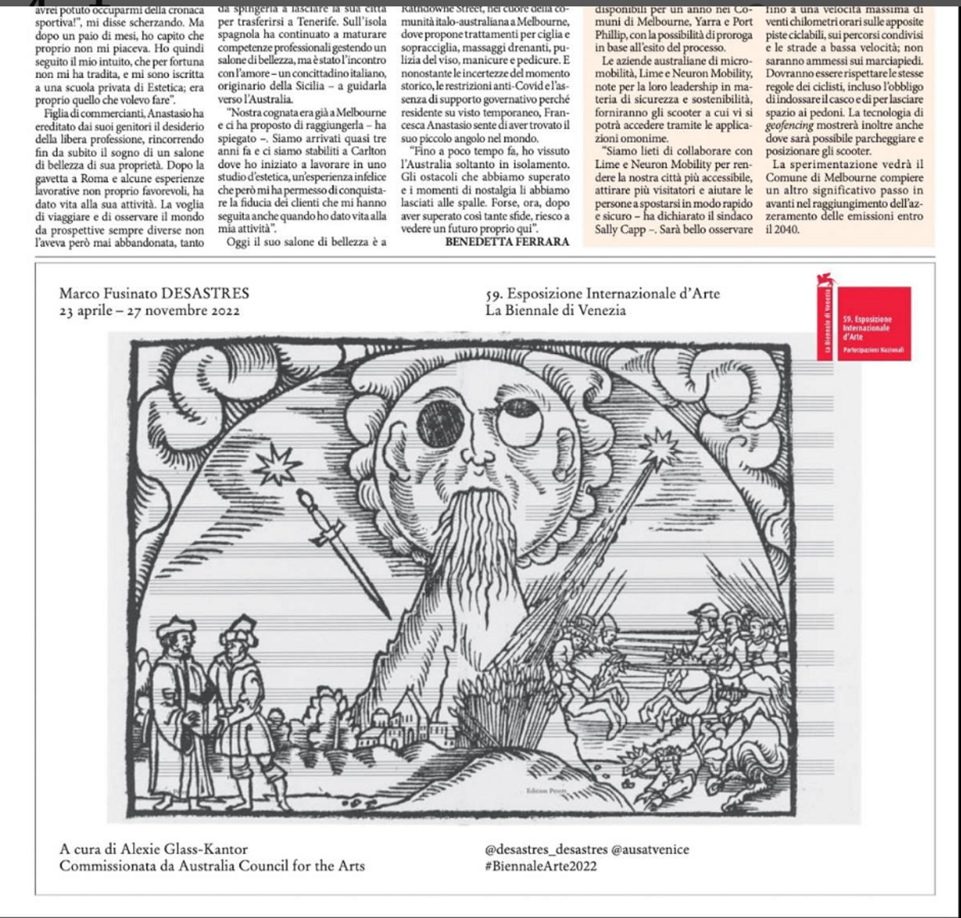 Marco Fusinato’s performance piece in the Australian pavilion is a wild ride of post punk noise and flashing images that overwhelm the senses. But the pavilion’s title Desastres (disasters in Spanish; inspired by Goya’s famous suite of prints) was announced in a much quieter way—on the pages of a small Italian-language newspaper published in Australia. And the reason for announcing the news in Il Globo rather than a more mainstream newspaper or art publication? The artist’s mamma! Fusinato’s parents emigrated to Australia from northern Italy shortly after he was born, and the artist grew up in an Italian community in Melbourne where the newspaper was always around. According to the pavilion’s curator Alexie Glass-Kantor, Fusinato was keen for his mother to get the news first so they took out two adverts in the newspaper. And what did mamma have to say about her son’s biggest art achievement to date? Apparently that he needed to make the lettering on the advert bigger as she missed it.