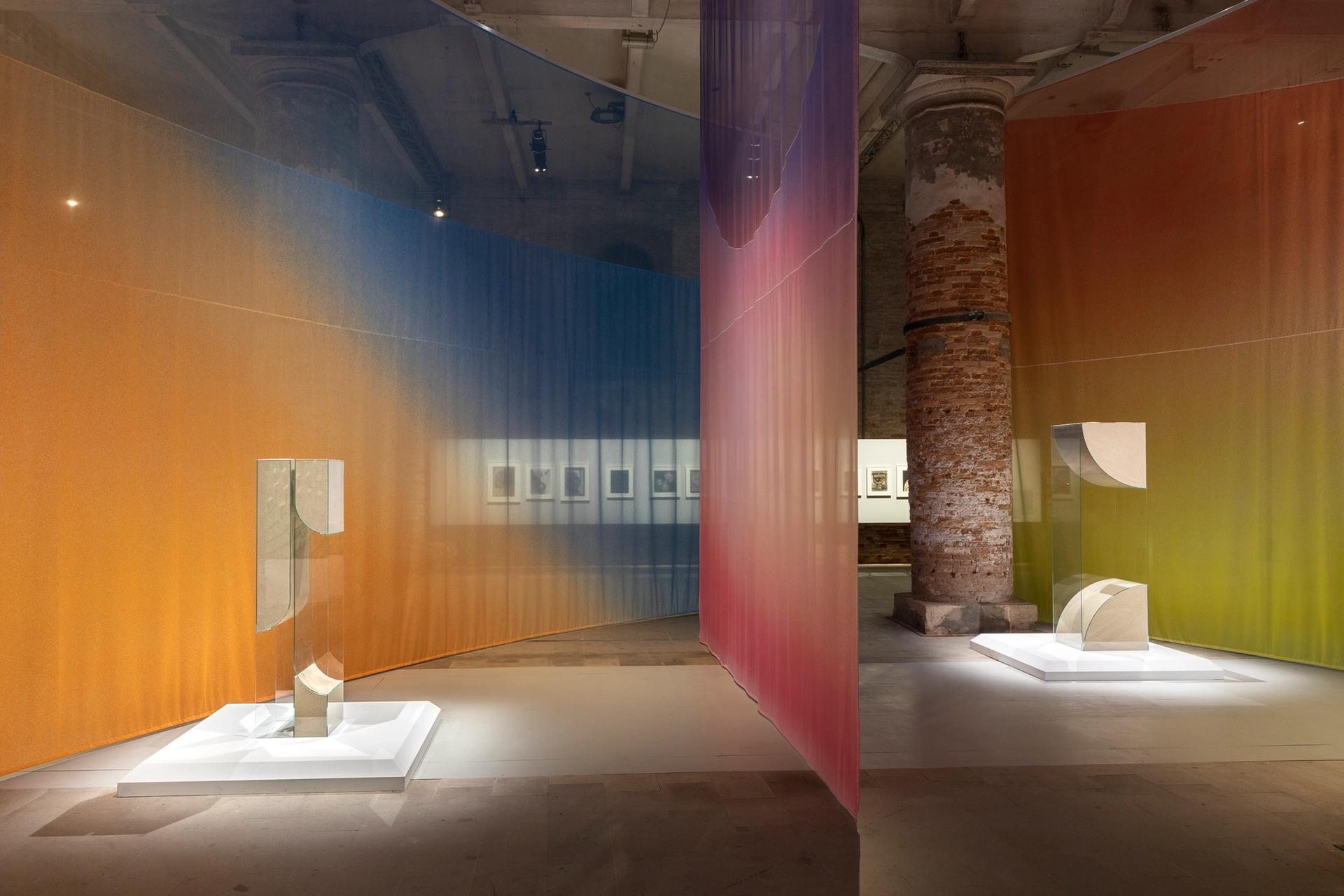 Kapwani Kiwanga's series of fabrice works Sunset Horizon (2022) and Hour glass series (2022) Photo: Roberto Marossi; Courtesy of La Biennale di Venezia