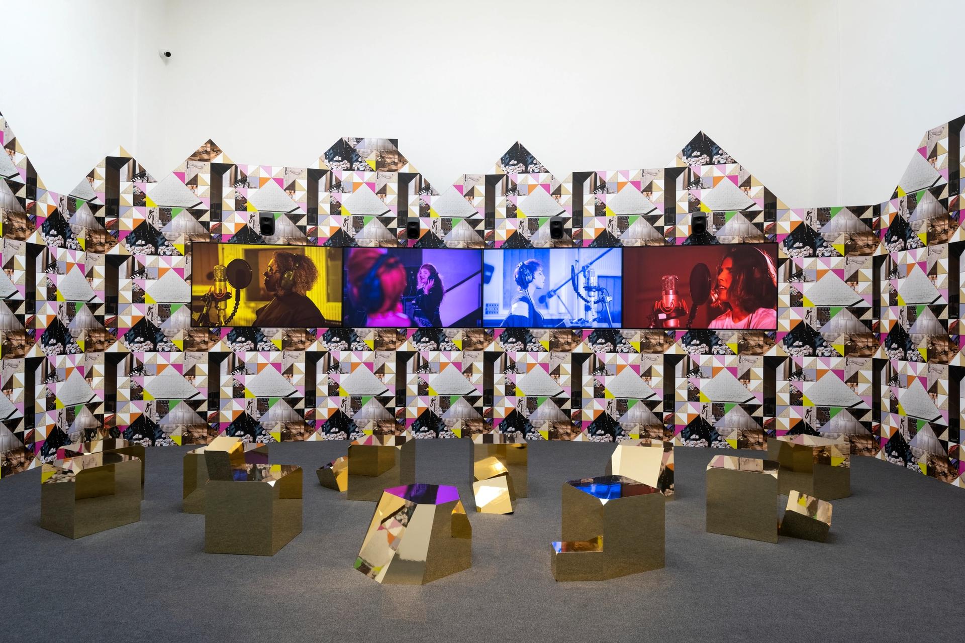 Boyce’s installation brings together video works featuring five Black women musicians of different generations—Poppy Ajudha, Jacqui Dankworth, Sofia Jernberg, Tanita Tikaram and composer Errollyn Wallen—who improvise, interact and play with their voices. “The resulting videos of the singers play out in an immersive, bright environment full of colourful wallpaper and golden embellishment,” the Guardian says.