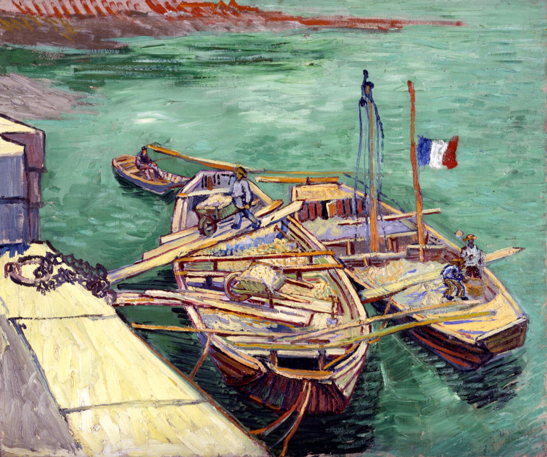 Van Gogh also wrote about a riverscape, painted a couple of minutes’ walk from the Yellow House by the Rhône: “A man unloading a sand boat. That is, there are two boats, purplish pink, in Veronese green water, with yellow-grey sand, wheelbarrows, planks, a little blue and yellow man. All of it seen from the top of a quay overhanging everything in a bird’s-eye view. No sky.”