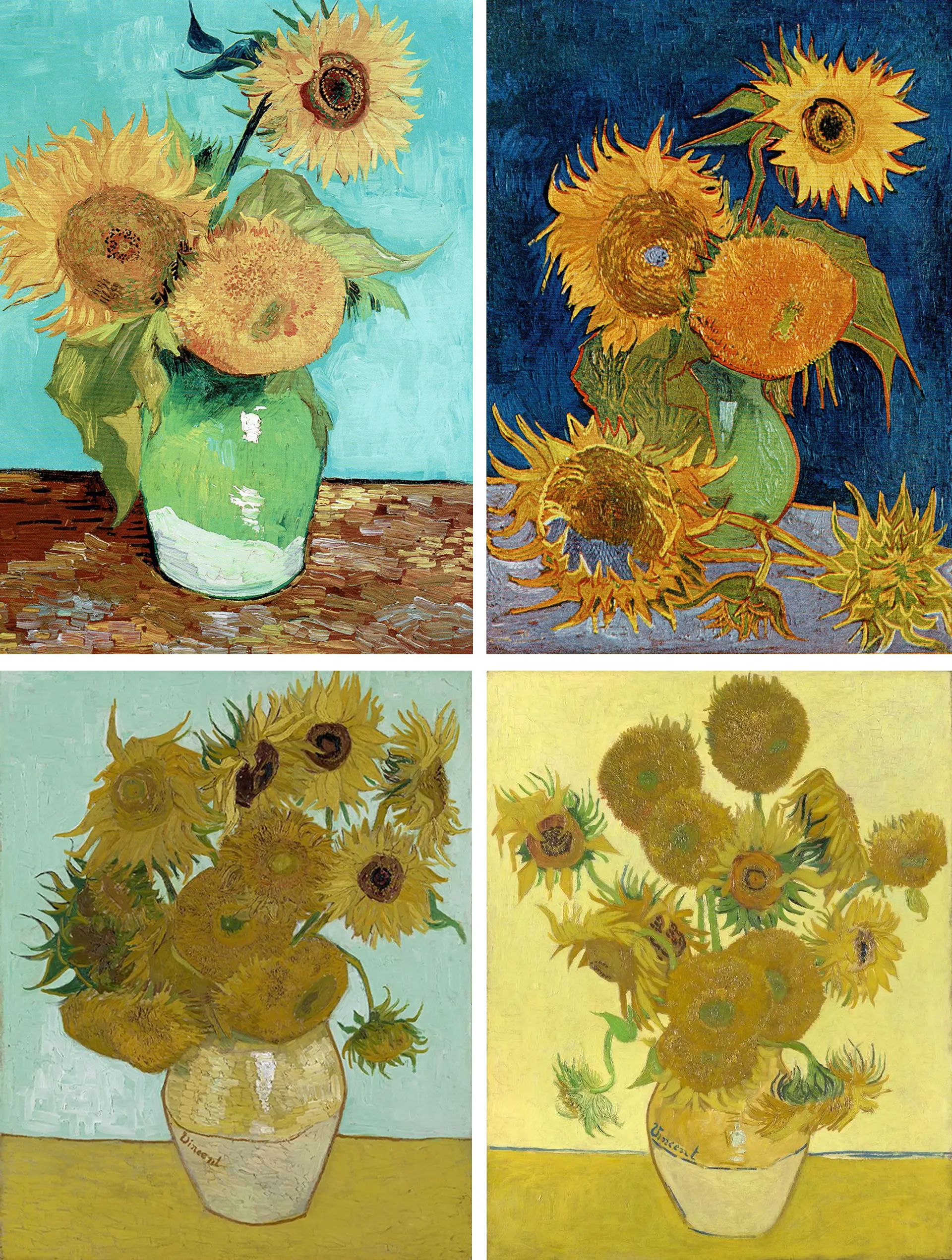 Van Gogh’s four Sunflower paintings of August 1888: the first (top left), now in a private collection; the second (top right), destroyed during the bombing of Japan in 1945; the third (bottom left), Neue Pinakothek, Munich; and the fourth (bottom right), National Gallery, London