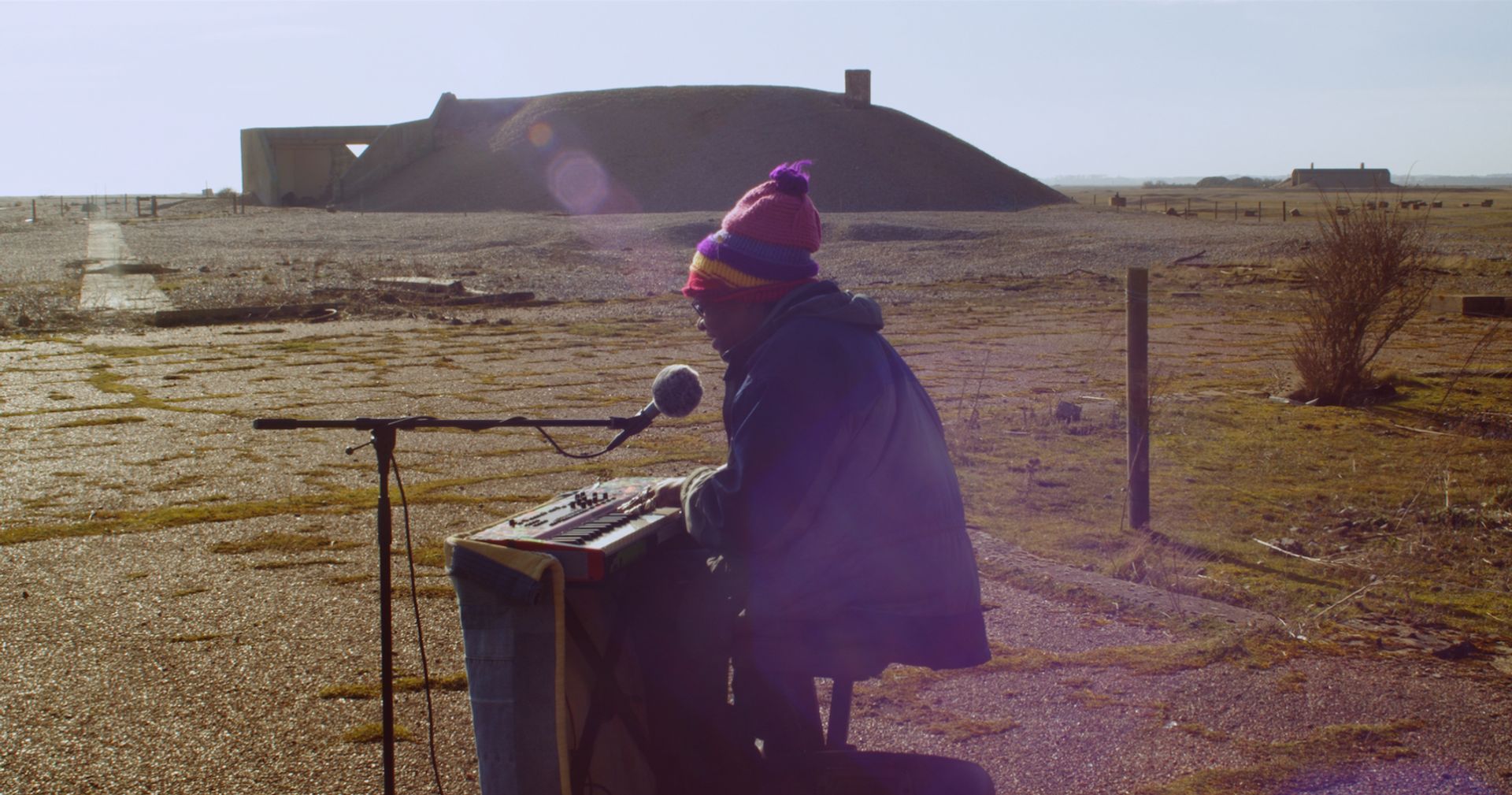 Lonnie Holley performing on Orford Ness in southern England, March 2022 in a still from The Edge of What, 2022