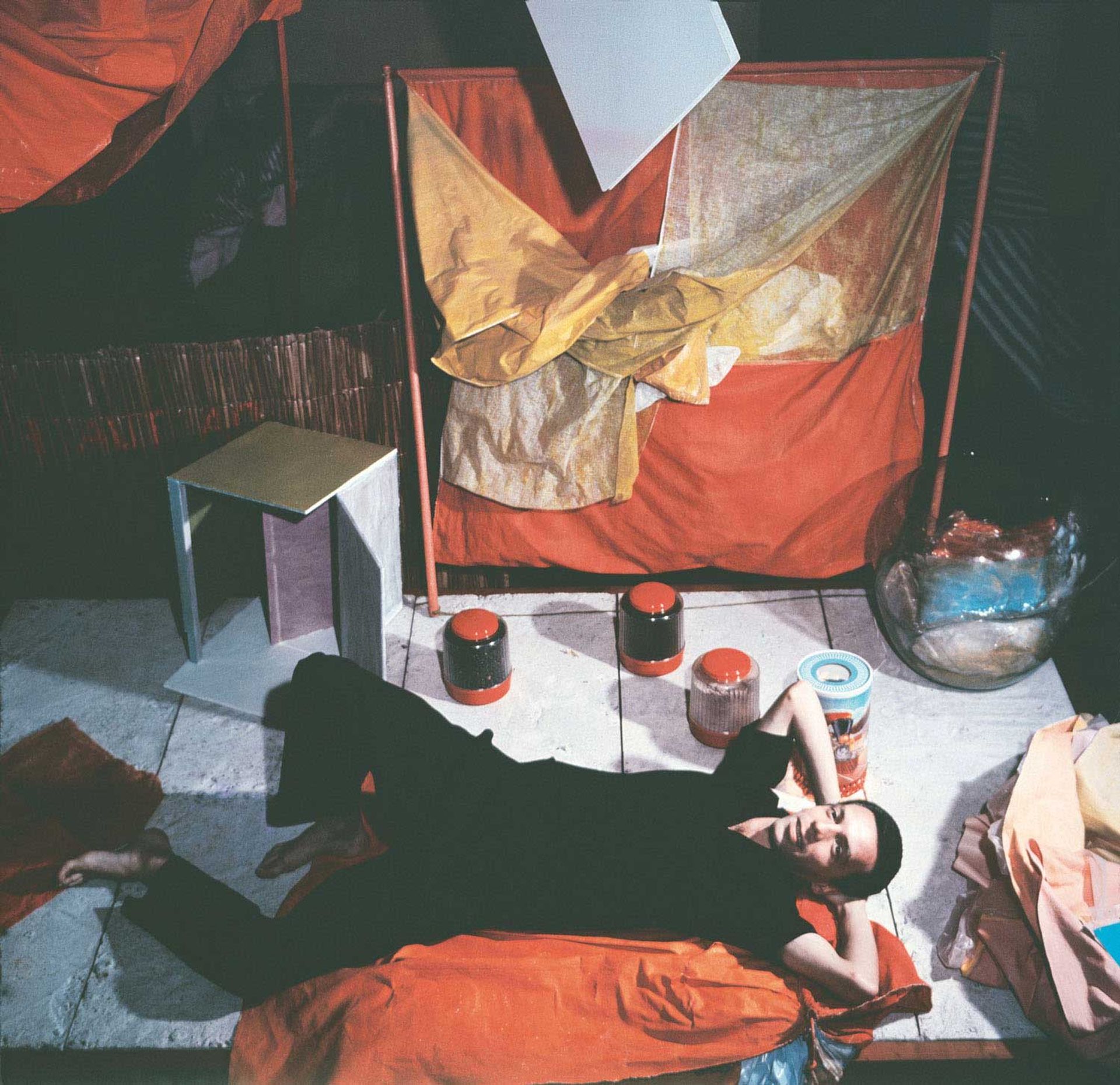 Hélio Oiticica with Bolides and Paragolés in his studio at Engenheiro Alfredo Duarte Street, Rio de Janeiro, 1965