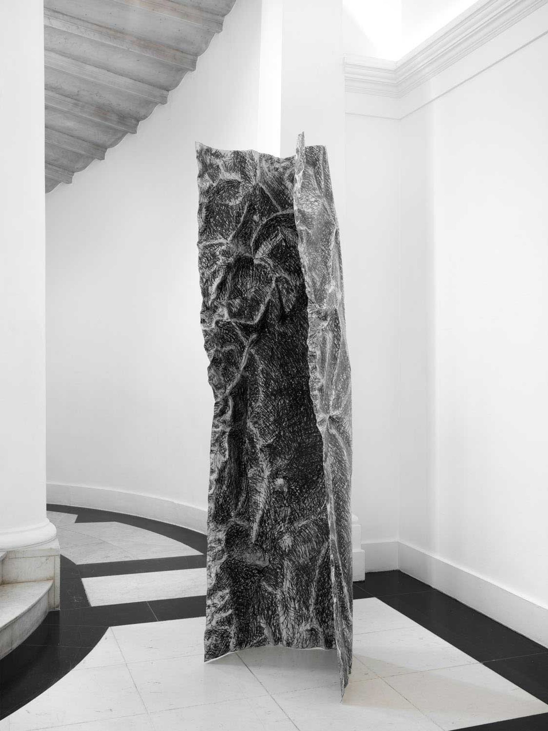 The underrated New York artist Rosemarie Castoro “subverted or overrode Minimalism on its own turf”, according to the critic Lucy Lippard. She invested her abstract works with a gestural, bodily quality that set her apart from male peers such as Carl Andre (her husband from 1964 to 1970), Lawrence Weiner and Sol LeWitt. She called herself a “paintersculptor” and brought a background in dance to her studio practice, wielding a broom and a saw to create her giant brushstroke wall pieces in gesso. They are the centrepiece of Thaddaeus Ropac’s show, swooping across the walls of the main gallery as if they had a life of their own. The metal works, too, are imbued with dynamism and delicacy. Shadow Flasher (1979) is a curved and crumpled steel sheet, covered in gesso and graphite scribbles like a blown-up piece of paper. Upstairs, freestanding welded sculptures with silvery folds evoke a group of figures in motion.