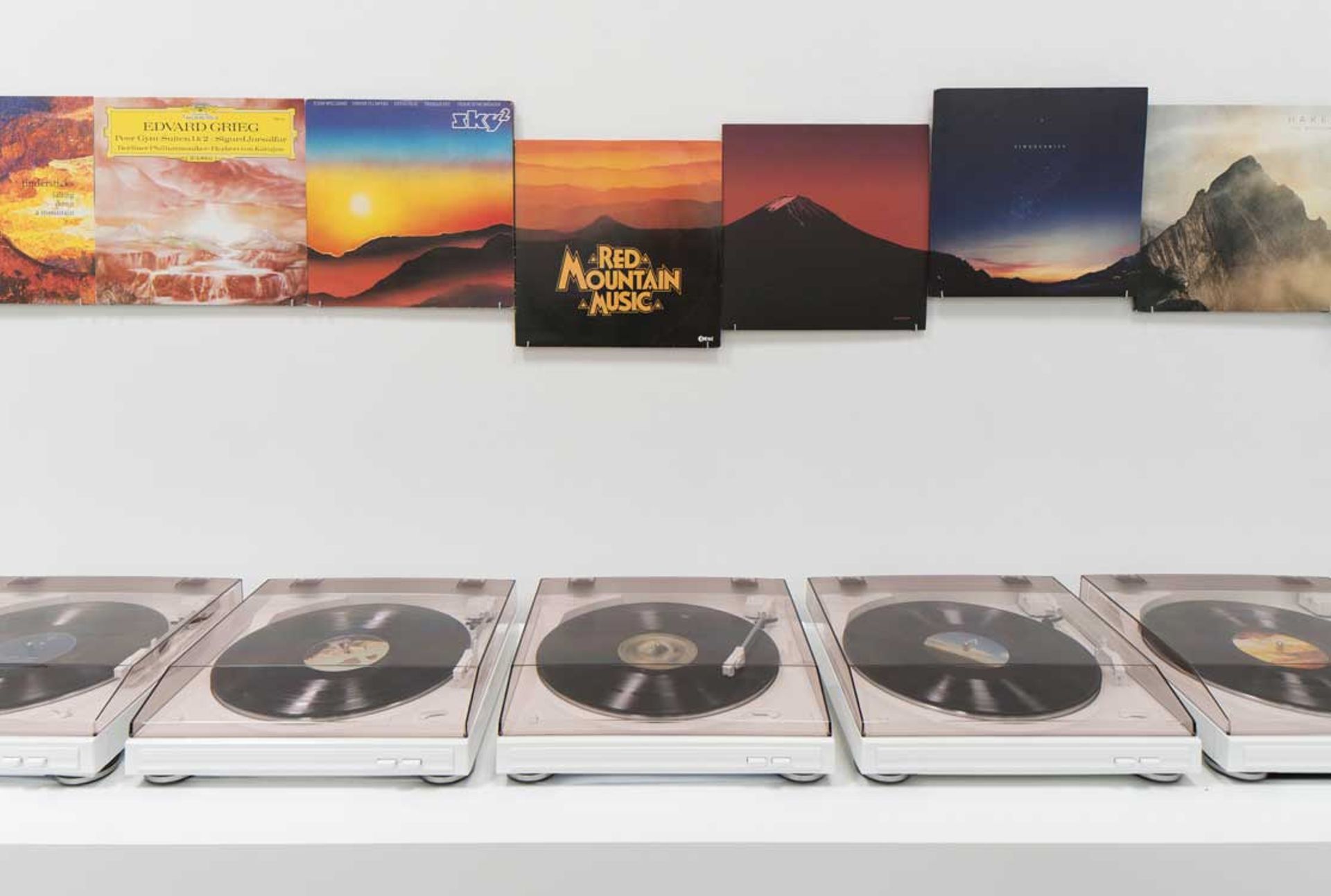 Melanie Manchot’s installation Alpine Diskomiks (2020) creates a sublime landscape from 50 album covers featuring mountains, which she arranges in an unbroken range of peaks around the gallery walls. Beneath them are turntables that play the records, beginning with a single electronic tune before rising to a cacophony—an avalanche of sound, as the gallery puts it. Downstairs is Snowdance (2019) in which machines are filmed by a drone making patterns in the snow with movements based on traditional Alpine folk dances.