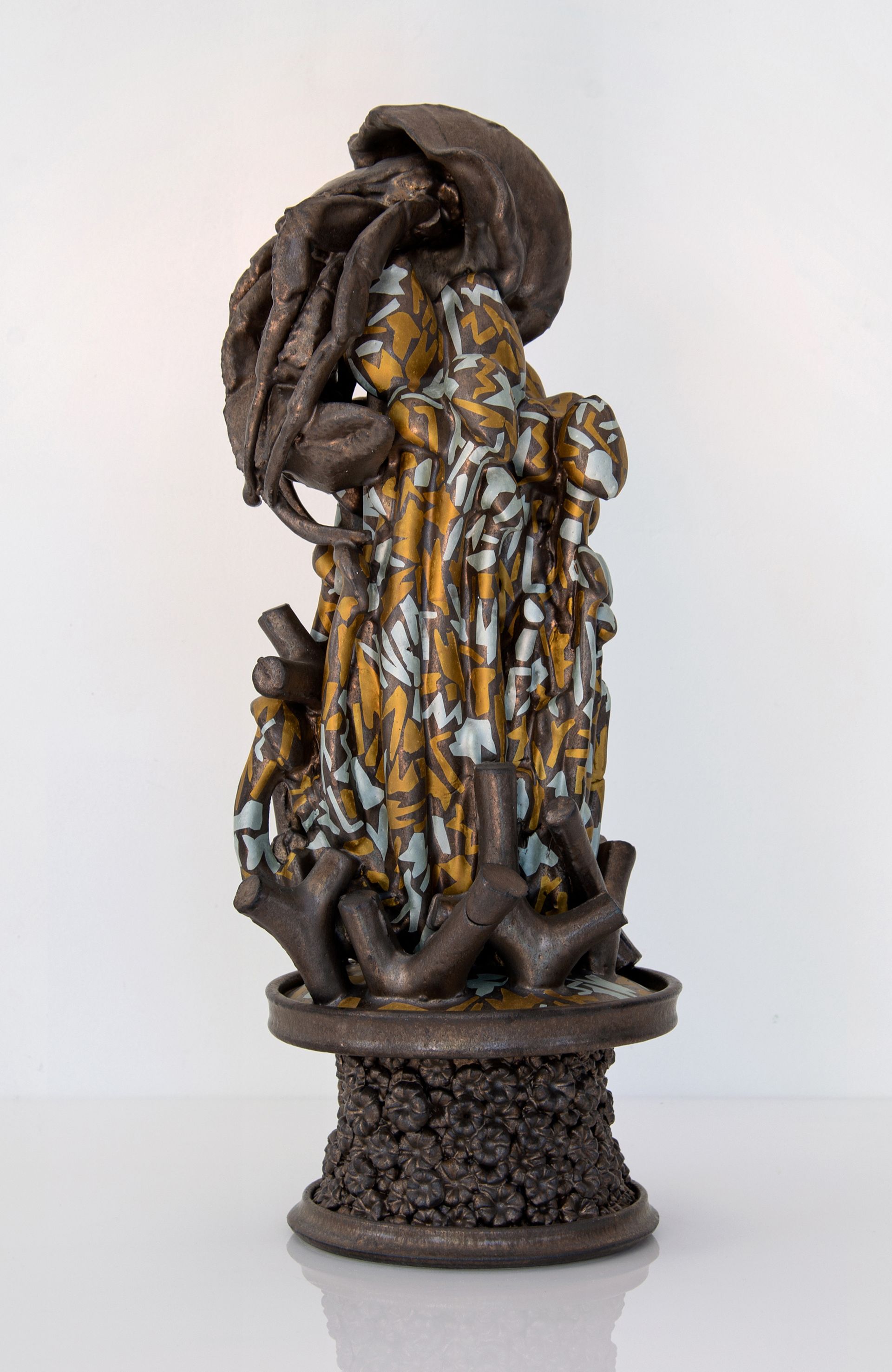 What if our lives could be as thoroughly designed and ordered as the interior of an aquarium? That seems to be the ideal of optimised habitation that the artist duo Future Retrieval (Guy Michael Davis and Katie Parker) is hinting at in this show, which takes its title and some inspiration from Ocean Gardens: The History of the Marine Aquarium, an 1857 book by the British illustrator and naturalist Noel Humphreys on man-made aquatic habitats. Appropriately, stepping into the duo’s exhibition feels something like plunging into an enormous aquarium brought to life by aluminium sculptures, collages of cut paper and a wool weaving based on illustrations of undersea plant life. But the stars of the show are the duo’s superb ceramic sculptures based on the imitation rocks and coral formations designed for use in home aquaria. Their psychedelic patterns and rippling forms give them such otherworldly auras, they could seemingly be the devotional objects of some deep-sea society of very sophisticated crabs. In fact, small crustaceans (likewise rendered in stoneware) stand perched on several of the faux coral sculptures, as if they were reclaiming these human approximations of nature’s strange, inimitable beauty for the crab kingdom.