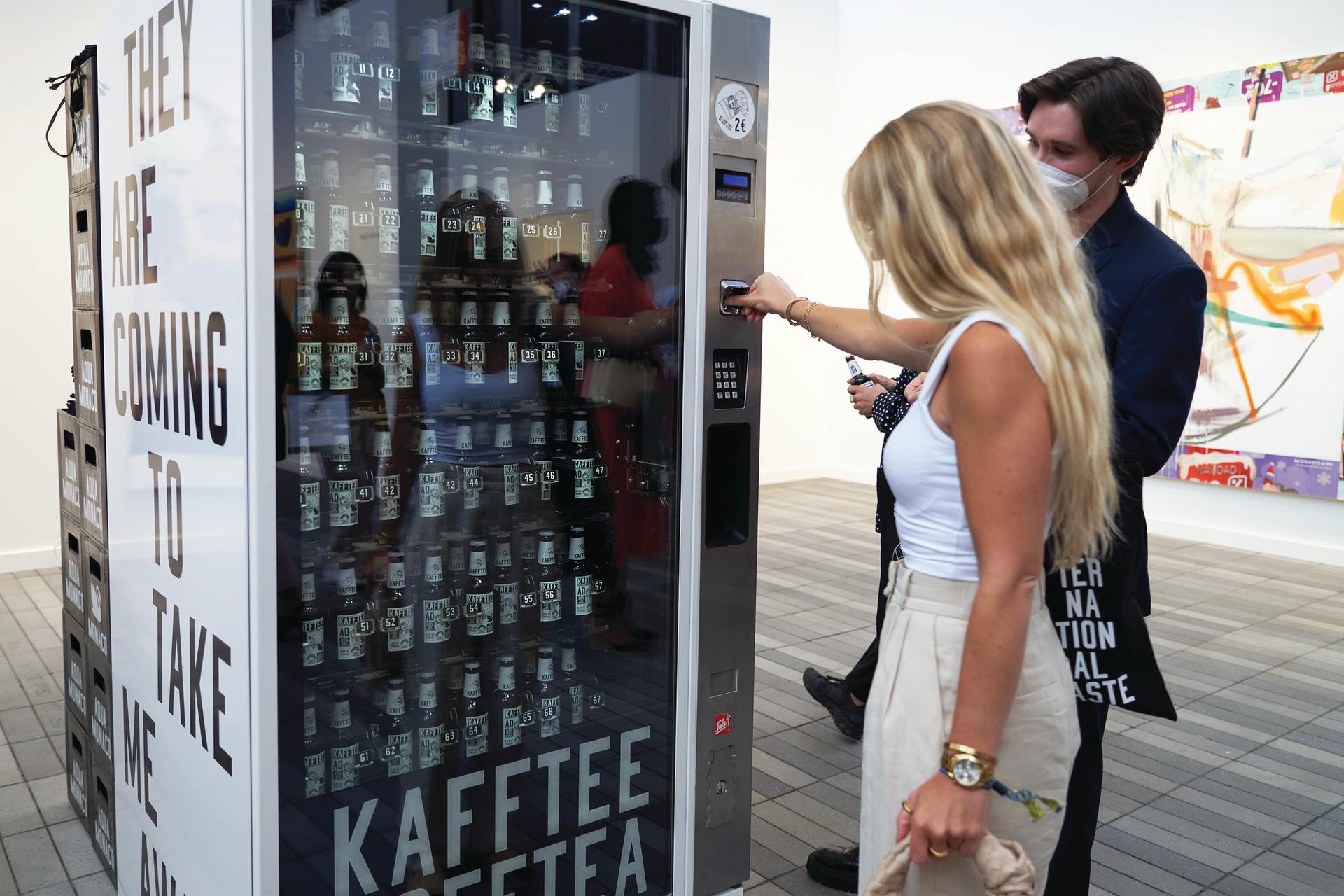 Fairgoers must use“fungible tokens” to buy Albert Oehlen’s bottled drink Photo by Allison Dinner