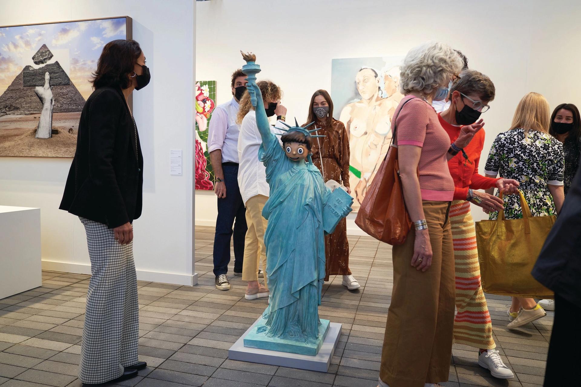 Visitors to Frieze New York’s VIP preview may have thought they were seeing double when they came across editions of the same Paola Pivi sculpture on Perrotin and Massimo de Carlo’s stands. The work, a 5ft-tall version of Frédéric Auguste Bartholdi’s iconic Statue of Liberty sporting a mask of a child-like face, is the Italy-born, Alaska-based artist’s reflection on the US’s self-image as a nation of immigrants. A large-scale version of the work is currently installed on the High Line, within view of Bartholdi’s monument on Liberty Island. “The mask is based on her son’s face,” says Anthony Bigot, a director at Massimo de Carlo. “She adopted a child from Tibet who had no papers, and the only country that would give him documents was the US.” By the end of opening day both galleries had turned over documents for the works, priced around $150,000, to collectors.