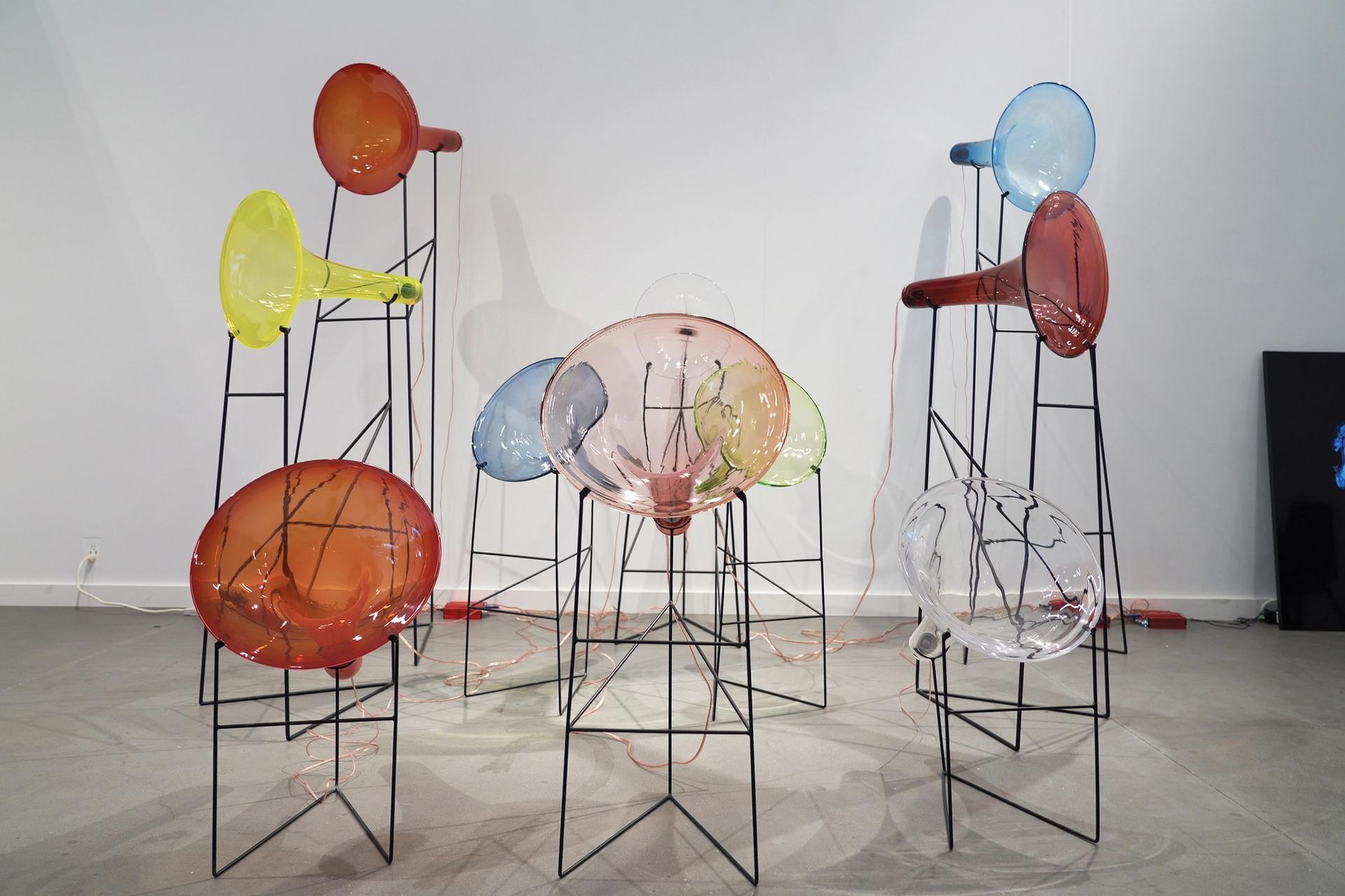 “This work has a sonic element and a video component examining the making of glass sculptures, and how that transformation from fire to glass creates a sound. It captures a sound of that transubstantiation and looks into the artisanal labour that goes into glass-blowing and how glass is also an industrial medium.”