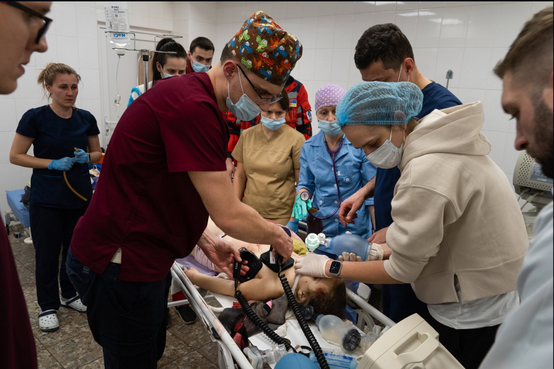Photograph by Mstyslav Chernov shows doctors attempting to resuccitate a young girl in the beseiged city of Mariupol. Courtesy of the artist and Russia War Crimes House