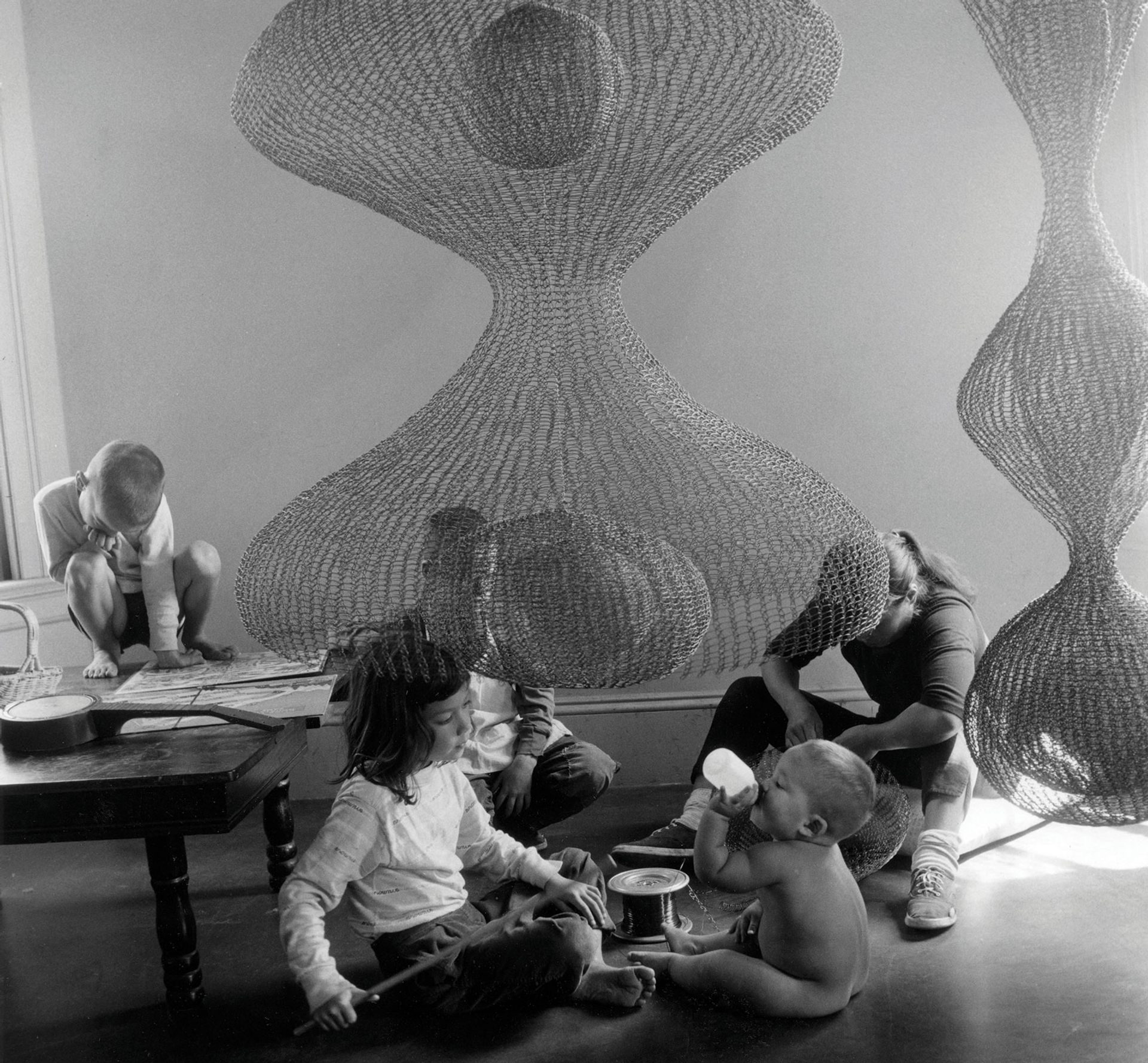 In a 1957 photograph by Imogen Cunningham, a baby drinks from a bottle of milk and children play, while their mother, the artist Ruth Asawa, studiously works on one of her sinuous wire sculptures. The image reveals how deeply life and art were entwined for the San Francisco-based artist, who made her studio in the family home where she raised six children. “Art deals directly with life,” she said, and the study of it means “learning basic principles essential to staying alive”.