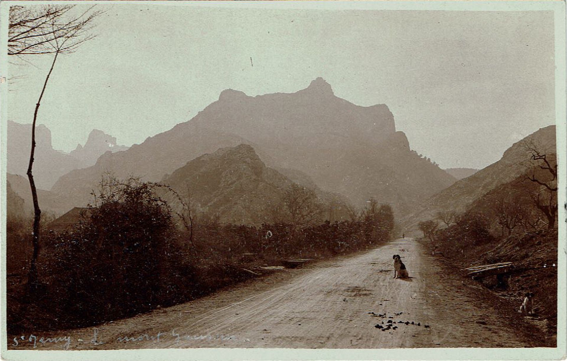 In the background of the postcard the dominant mountain with three peaks is Mont Gaussier (Van Gogh depicted only the two left peaks in his painting). Les Deux Trous can just be seen in the postcard, in the far distance, to the left of Mont Gaussier.